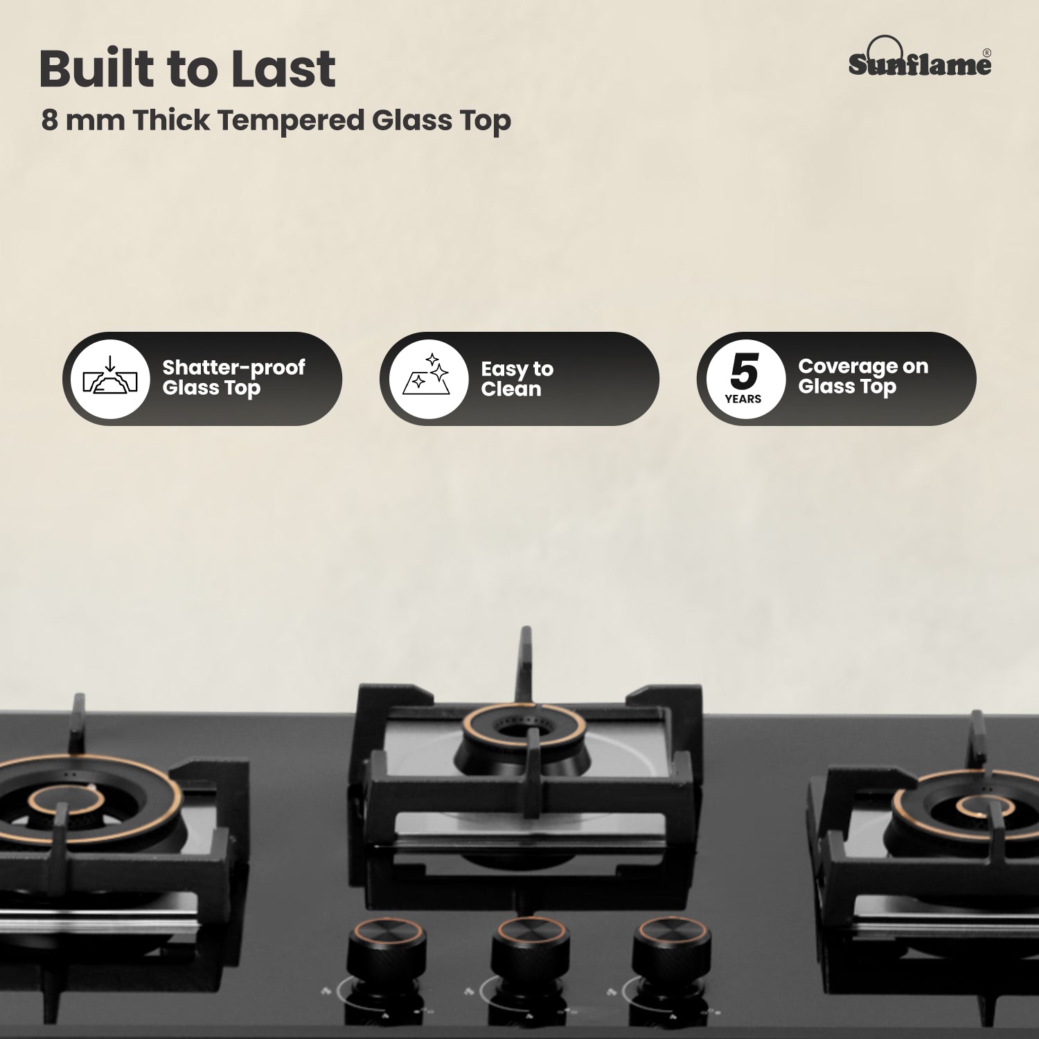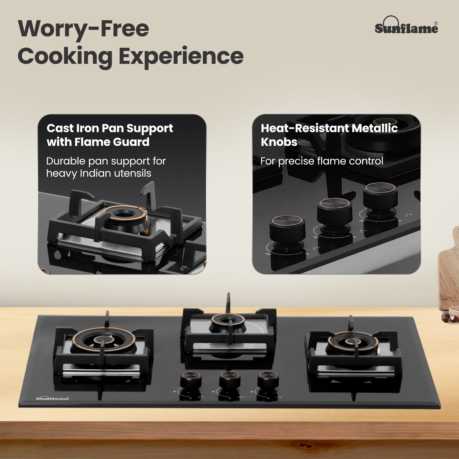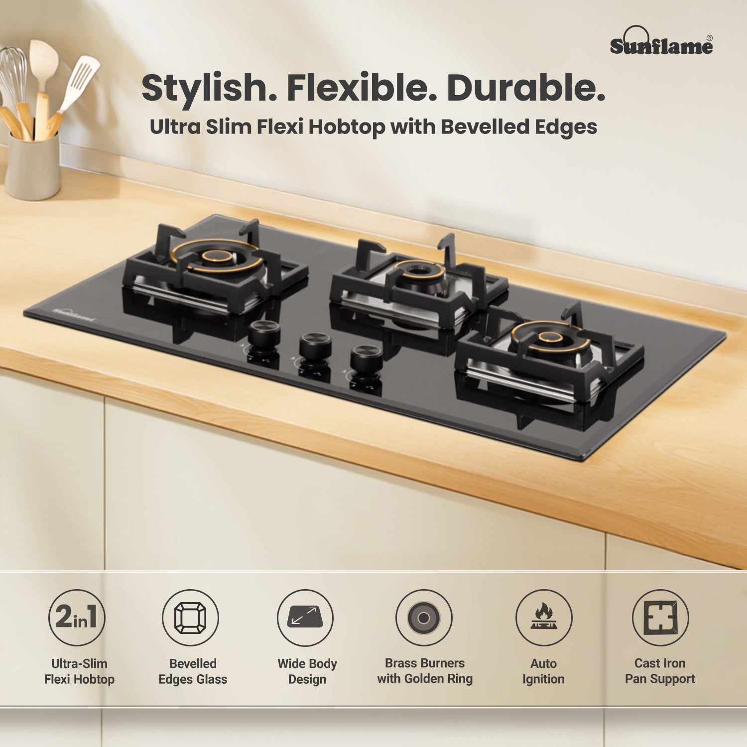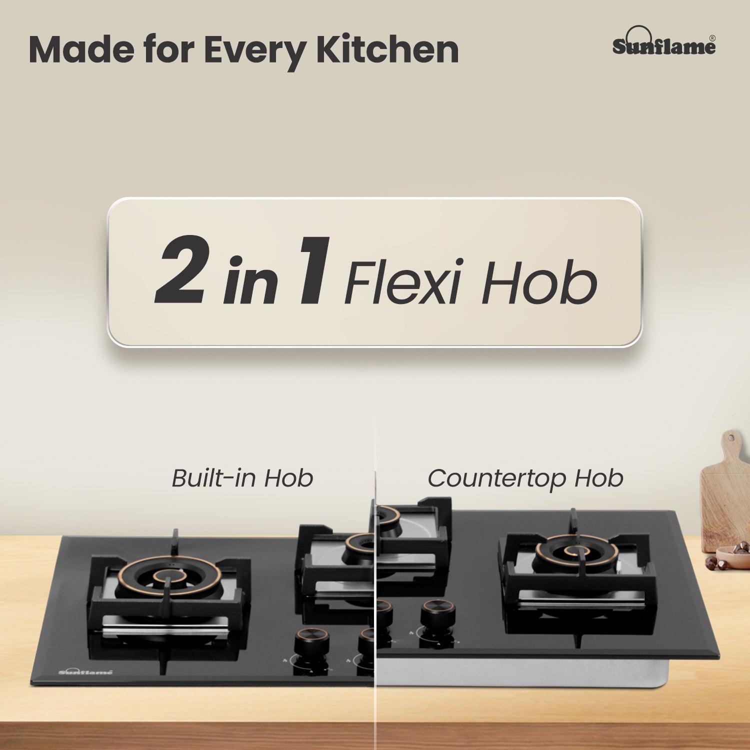 The Sunflame 3-Burner Flexi 2-in-1 Hob offers a perfect blend of style and performance. Its 2-in-1 design allows for both countertop and built-in installation, making it suitable for any kitchen countertop. The sleek bevelled edges glass top brings both durability and elegance to your space. The hob features three high-efficiency brass burners with dual and triple-ring flames, delivering even heat for fast cooking. The stylish golden ring design of the burners adds a premium aesthetic look to the hob. Sturdy cast iron pan supports provide stability for heavy Indian cookware, and these pan supports come with flame guard to keep the knobs cool and shield the flame from wind. The hob features a durable 8 mm thick tempered glass top for a sleek, modern look. The 1.5 V battery-operated auto-ignition enables quick burner ignition, while ergonomic, heat-resistant metallic knobs provide precise flame control. Its wide body design supports multitasking with ease, enabling the simultaneous use of multiple cookware items. Featuring a flexi rotating LPG inlet nozzle offers flexible connection to the LPG hose pipe and concealed stainless steel drip trays provide mess-free cleaning. Backed by 5 years of warranty on the glass top, 2 years on burners, valves, and the product, and 5 years of doorstep service, Sunflame offers complete peace of mind. With PAN India presence across 240+ service centers, Sunflame ensures reliable performance and dependable after-sales support.