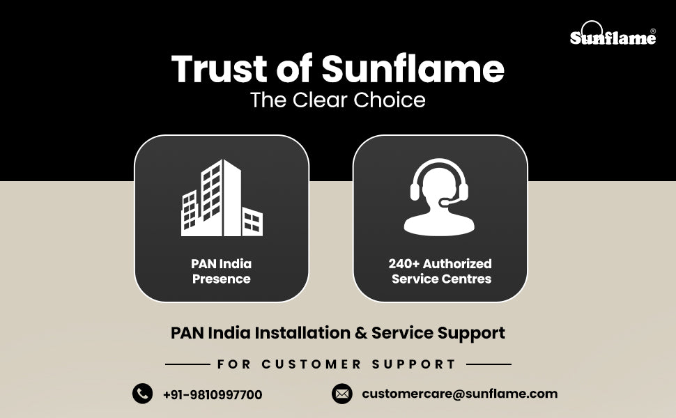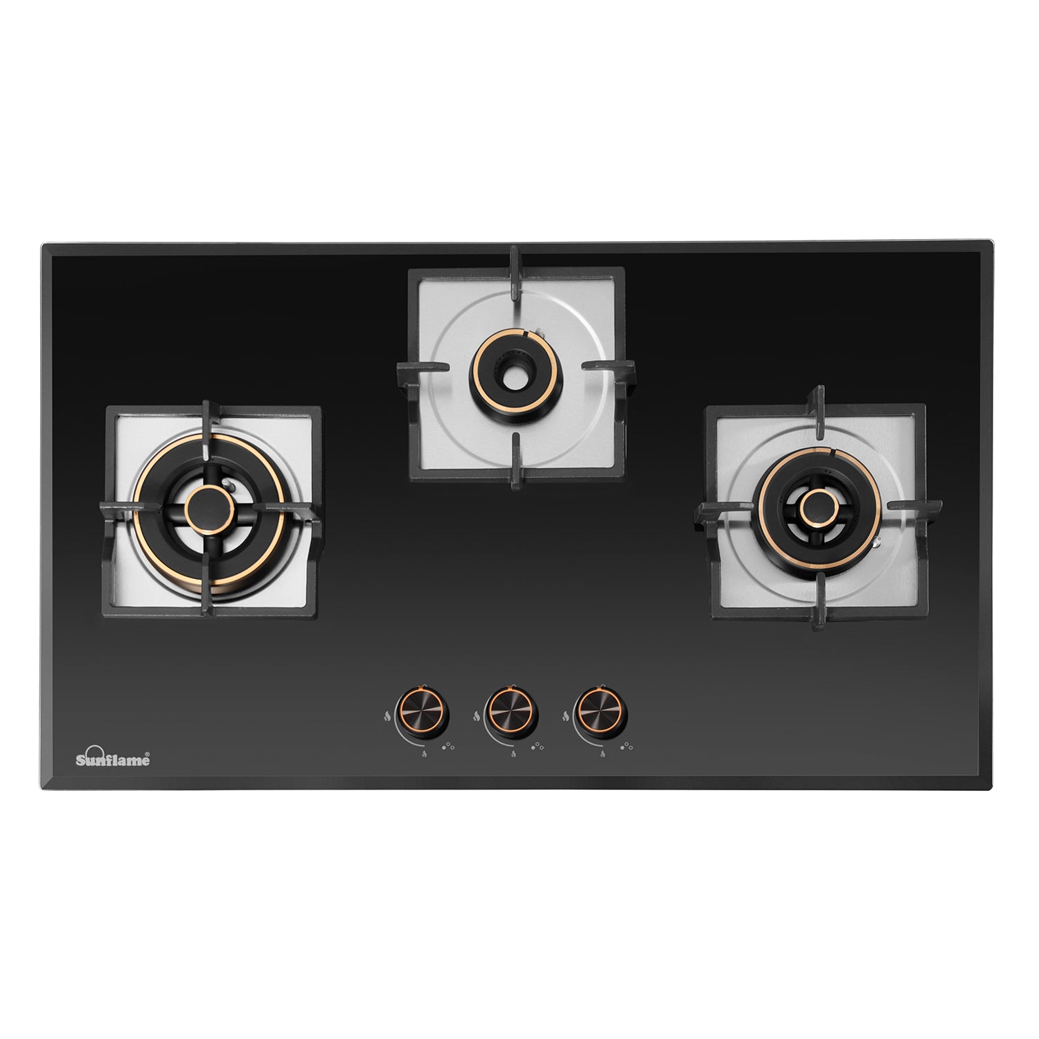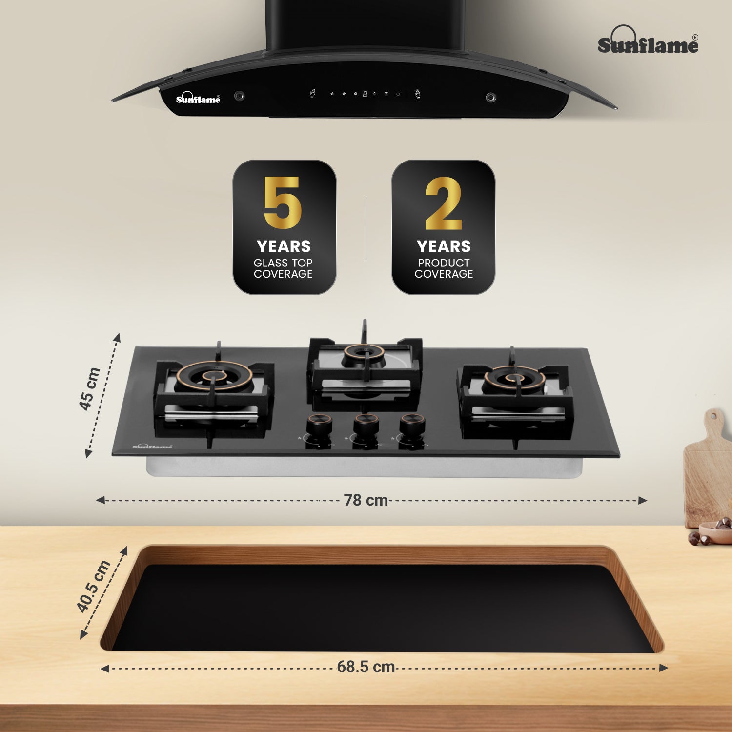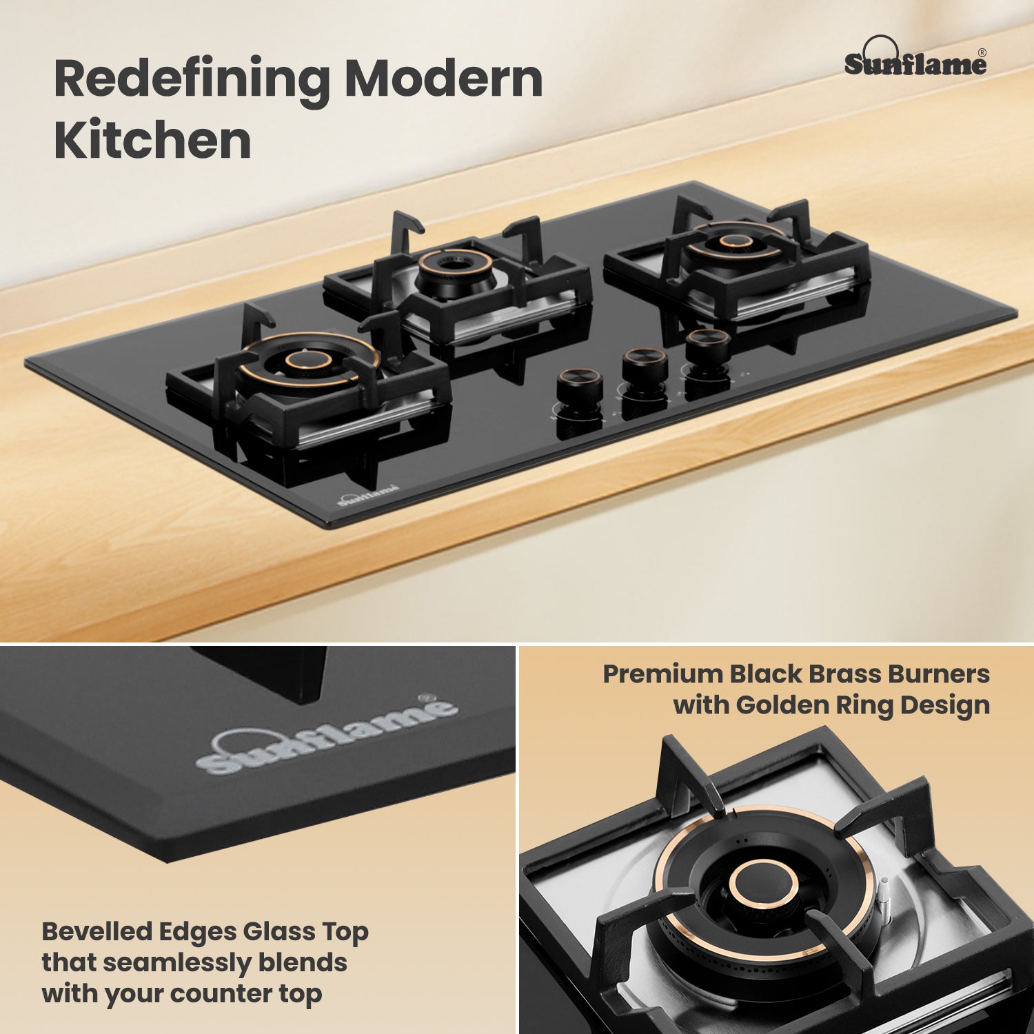 The Sunflame 3-Burner Flexi 2-in-1 Hob offers a perfect blend of style and performance. Its 2-in-1 design allows for both countertop and built-in installation, making it suitable for any kitchen countertop. The sleek bevelled edges glass top brings both durability and elegance to your space. The hob features three high-efficiency brass burners with dual and triple-ring flames, delivering even heat for fast cooking. The stylish golden ring design of the burners adds a premium aesthetic look to the hob. Sturdy cast iron pan supports provide stability for heavy Indian cookware, and these pan supports come with flame guard to keep the knobs cool and shield the flame from wind. The hob features a durable 8 mm thick tempered glass top for a sleek, modern look. The 1.5 V battery-operated auto-ignition enables quick burner ignition, while ergonomic, heat-resistant metallic knobs provide precise flame control. Its wide body design supports multitasking with ease, enabling the simultaneous use of multiple cookware items. Featuring a flexi rotating LPG inlet nozzle offers flexible connection to the LPG hose pipe and concealed stainless steel drip trays provide mess-free cleaning. Backed by 5 years of warranty on the glass top, 2 years on burners, valves, and the product, and 5 years of doorstep service, Sunflame offers complete peace of mind. With PAN India presence across 240+ service centers, Sunflame ensures reliable performance and dependable after-sales support.