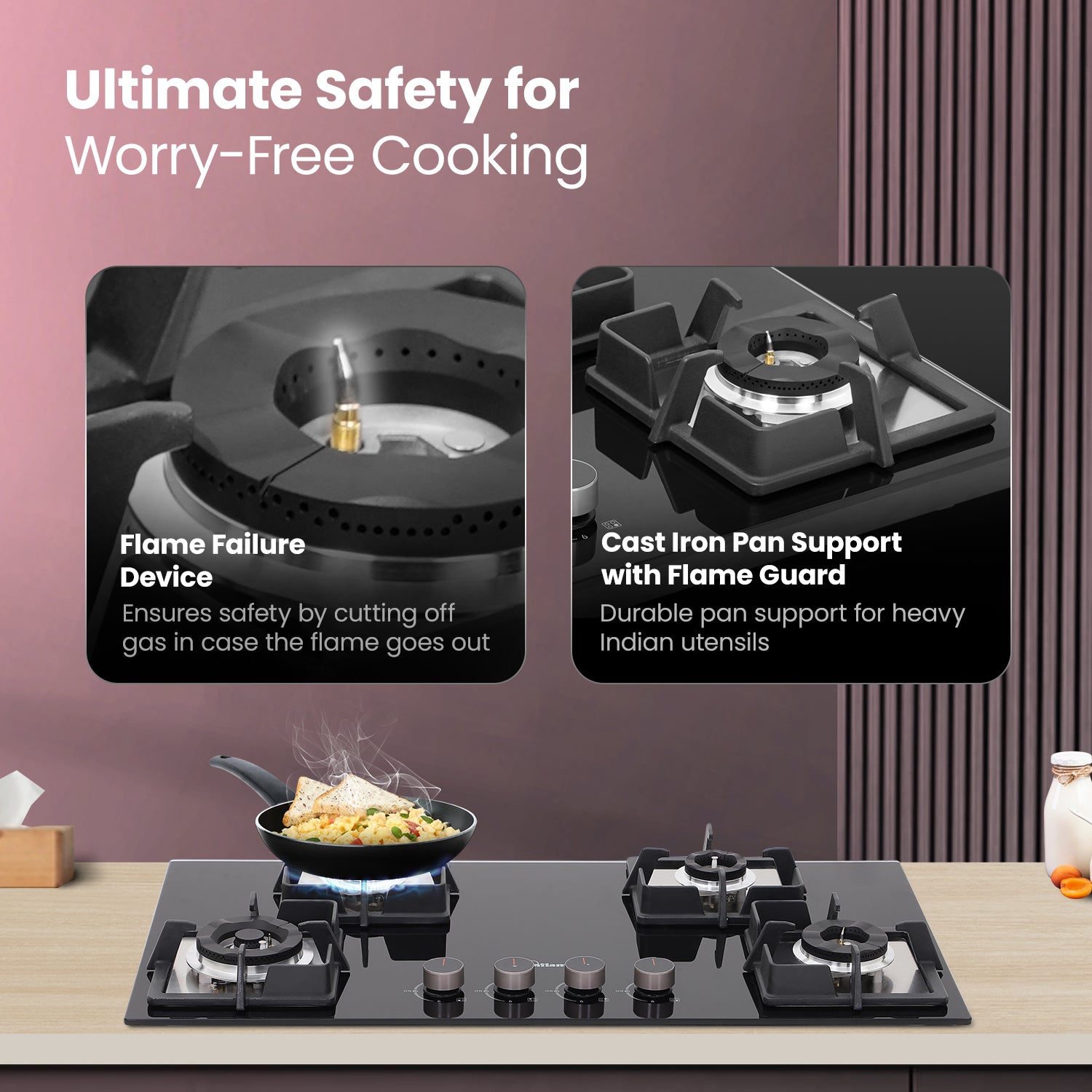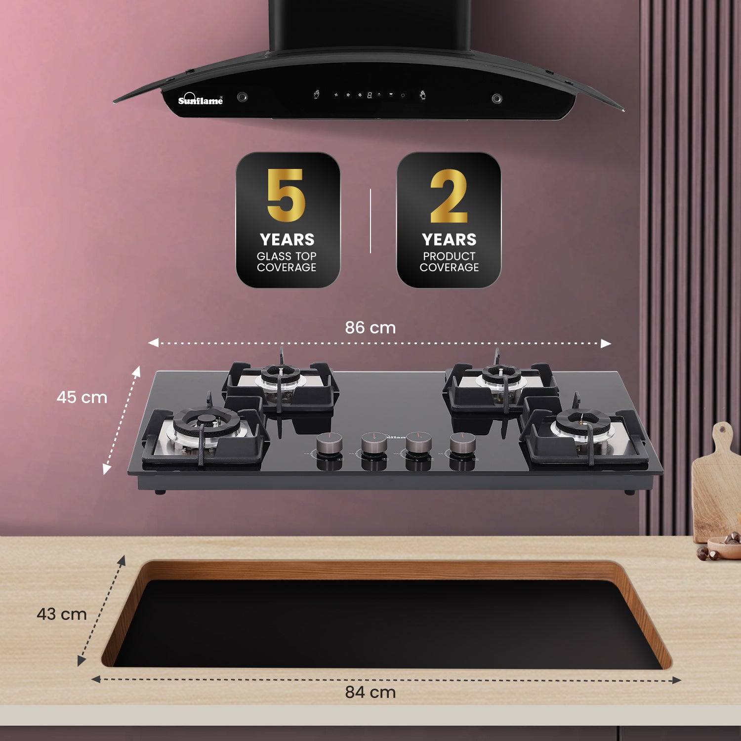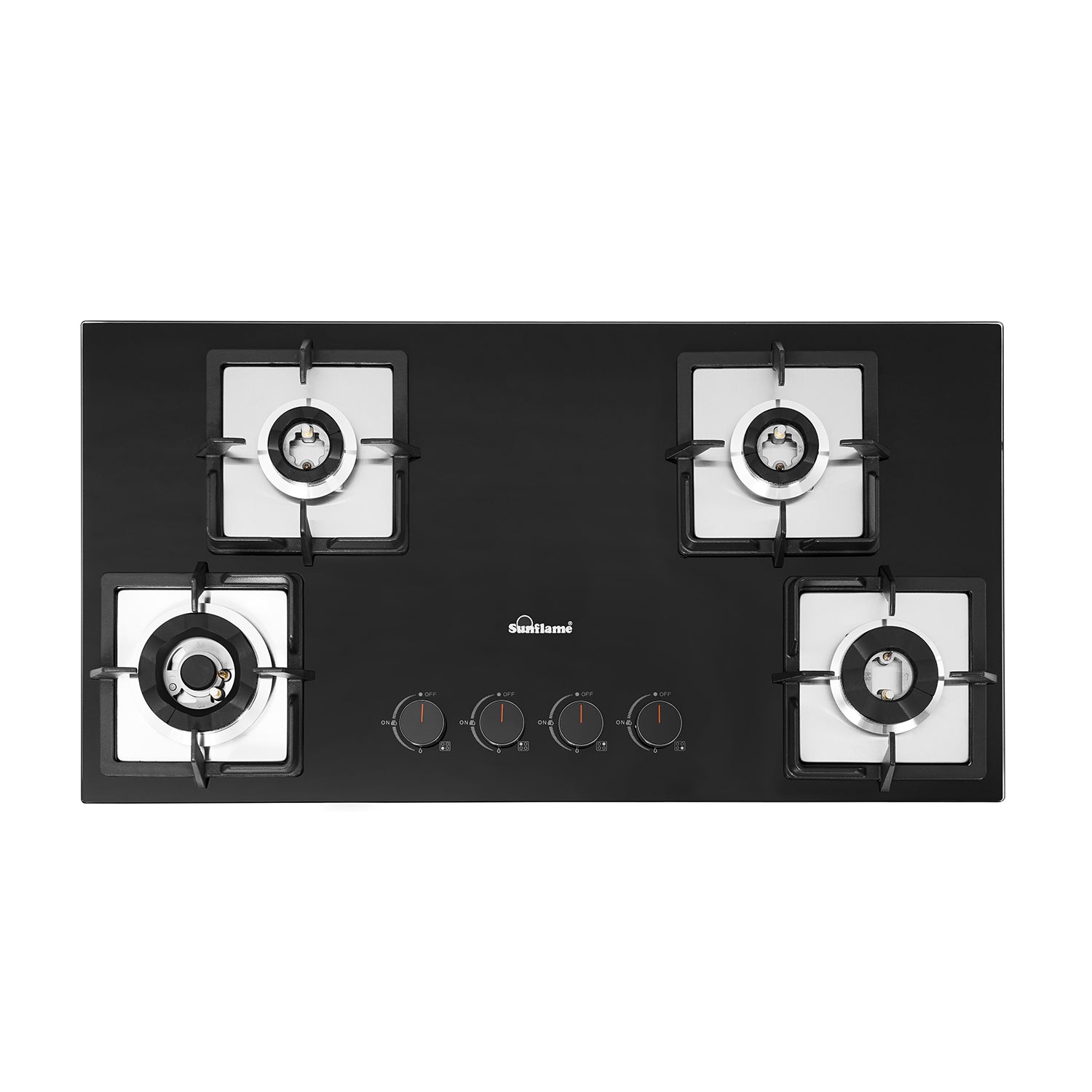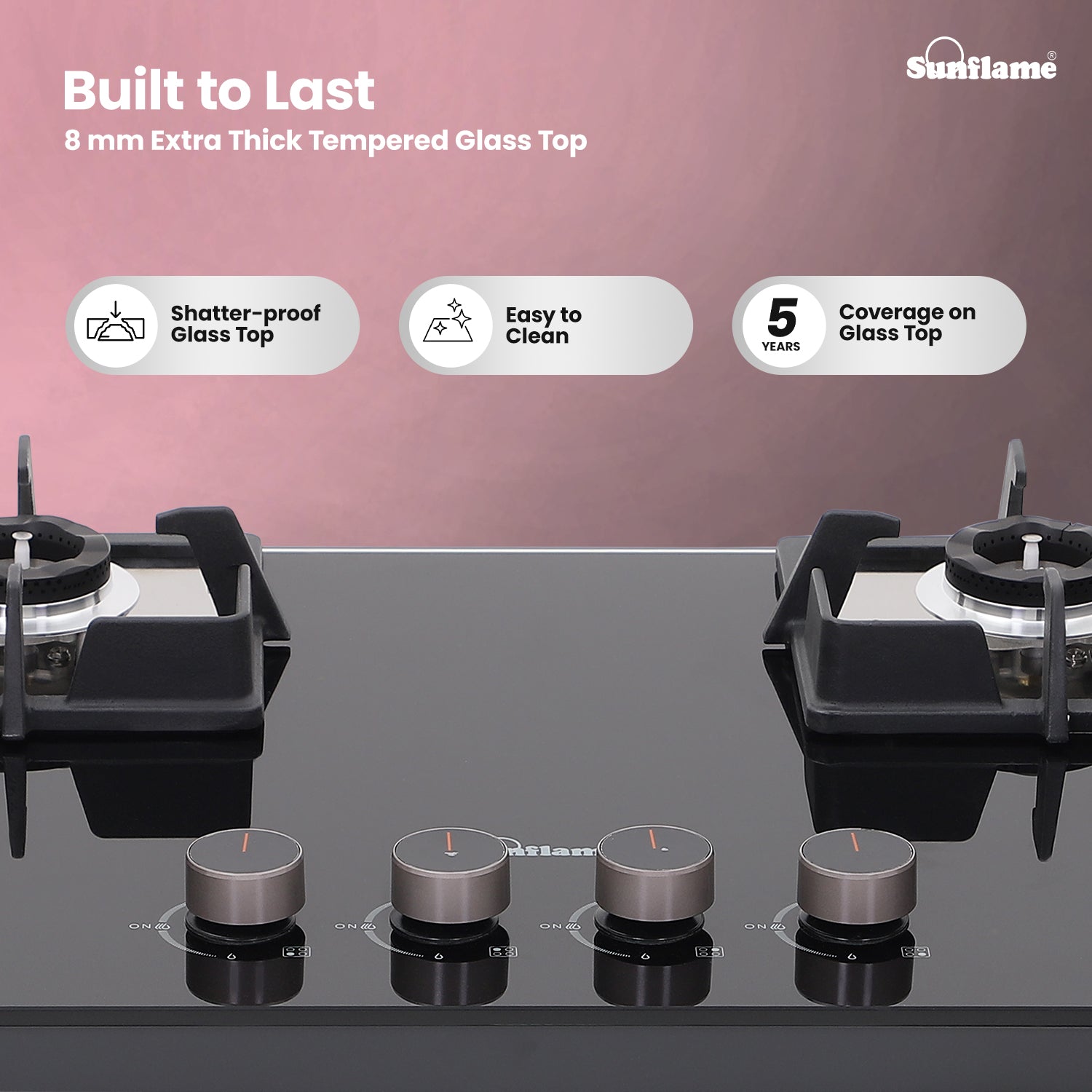 The Sunflame 4-Burner Flexi 2-in-1 Hob offers a perfect blend of style and performance. Its 2-in-1 design allows for both countertop and built-in installation, making it suitable for any kitchen countertop. For advanced safety, the Flame Failure Device automatically cuts off gas if the flame goes out. The hob features four high-efficiency brass burners with dual and triple-ring flames, delivering even heat for fast cooking. The stylish crown design of the burners adds a premium aesthetic look to the hob. Sturdy cast iron pan supports provide stability for heavy Indian cookware, and these pan supports come with flame guard to keep the knobs cool and shield the flame from wind. The hob features a durable 8 mm thick tempered glass top for a sleek, modern look. The 1.5 V battery-operated auto-ignition enables quick burner ignition, while ergonomic, heat-resistant metallic knobs provide precise flame control. Its ultra-wide body design supports multitasking with ease, enabling the simultaneous use of multiple cookware items. Featuring a flexi rotating LPG inlet nozzle offers flexible connection to the LPG hose pipe and concealed stainless steel drip trays provide mess-free cleaning. Backed by 5 years of coverage on the glass top, 2 years on burners, valves, and the product, and 5 years of doorstep service, Sunflame offers complete peace of mind. With PAN India presence across 240+ service centers, Sunflame ensures reliable performance and dependable after-sales support.