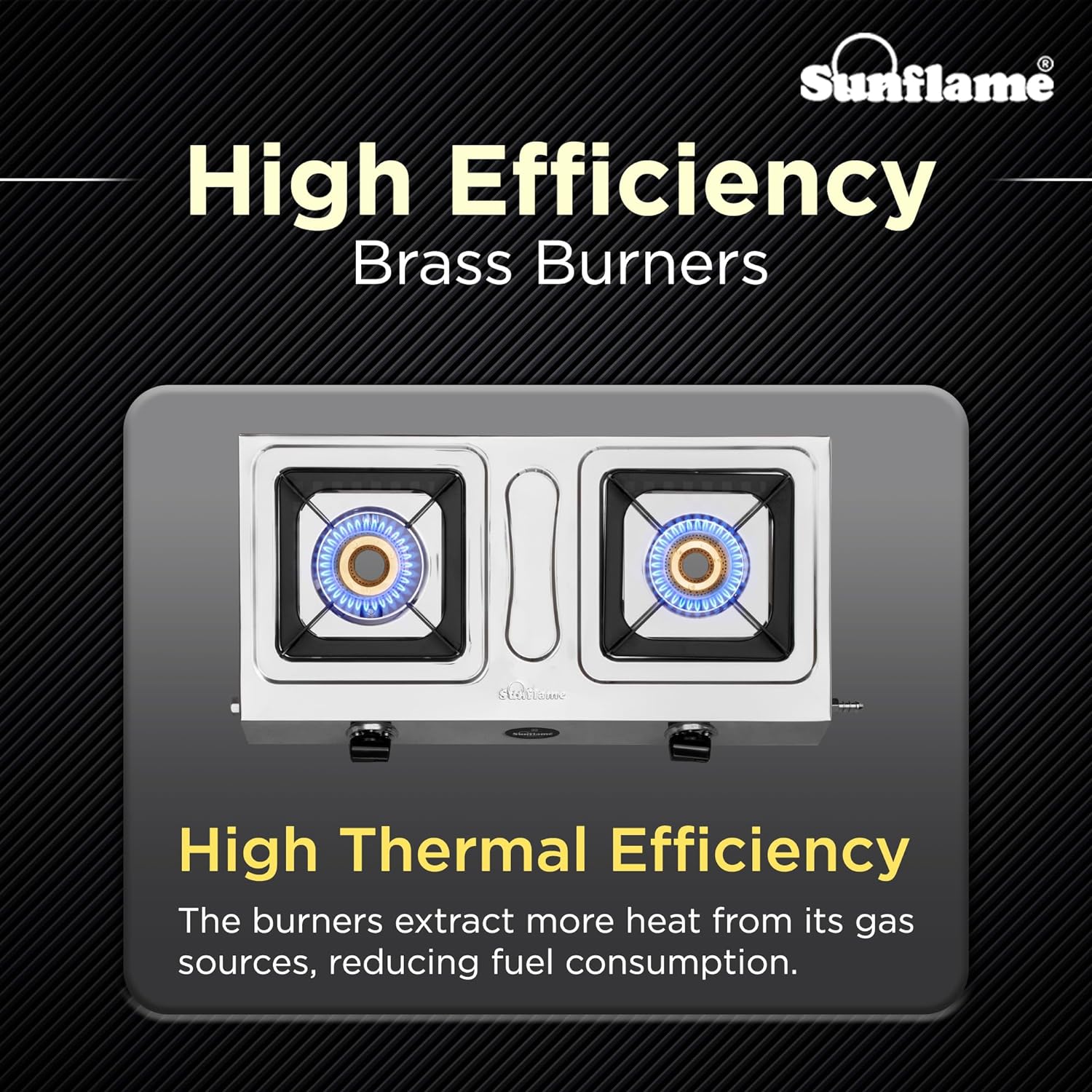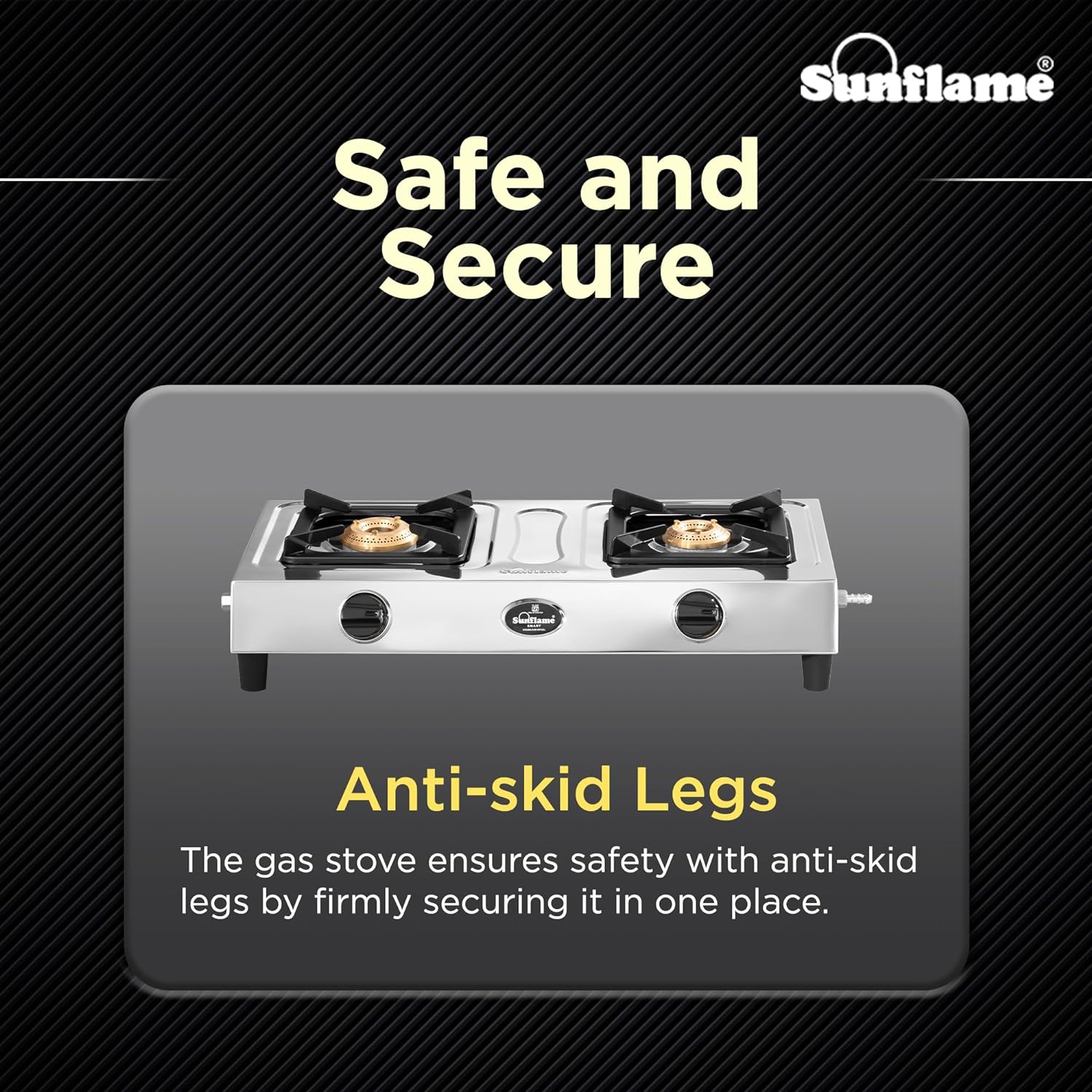The Sunflame 2 Burner Smart Stainless Steel Gas Stove is a premium design that enhances the elegance of upscale kitchens. Its robust body is made of non-magnetic stainless steel, and its heat-resistant nylon knobs make it easy to adjust heat levels. The stove has been safety certified with ISI, adhering to BIS standards. It comes with a two-year warranty, including Pan India Doorstep Services, and features anti-skid legs for secure cooking. It operates manually and emits minimal CO2,