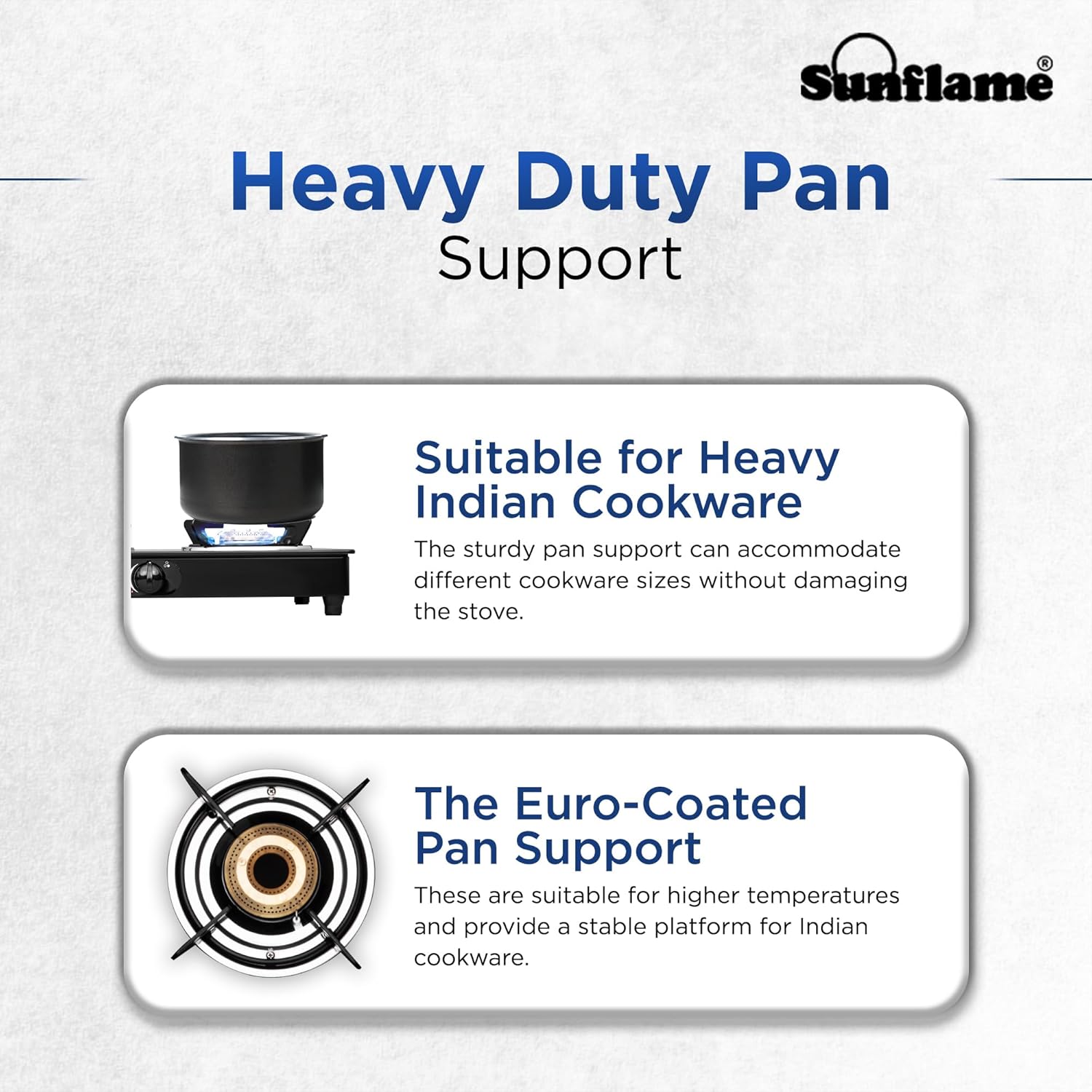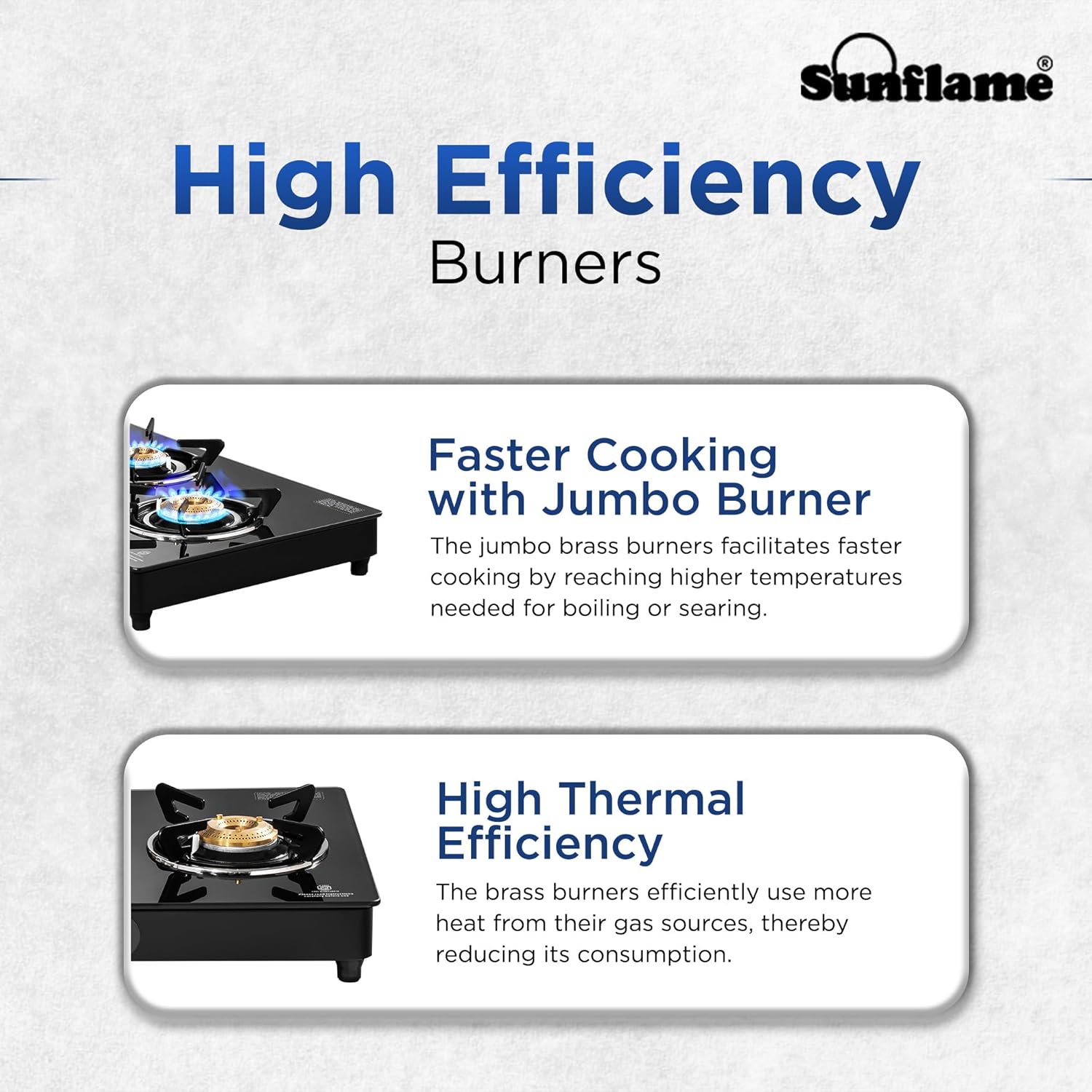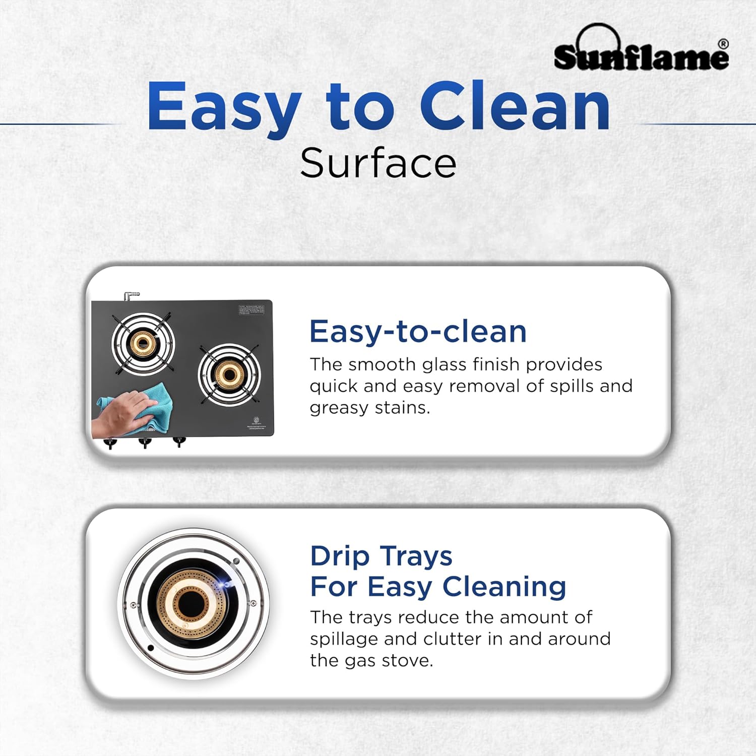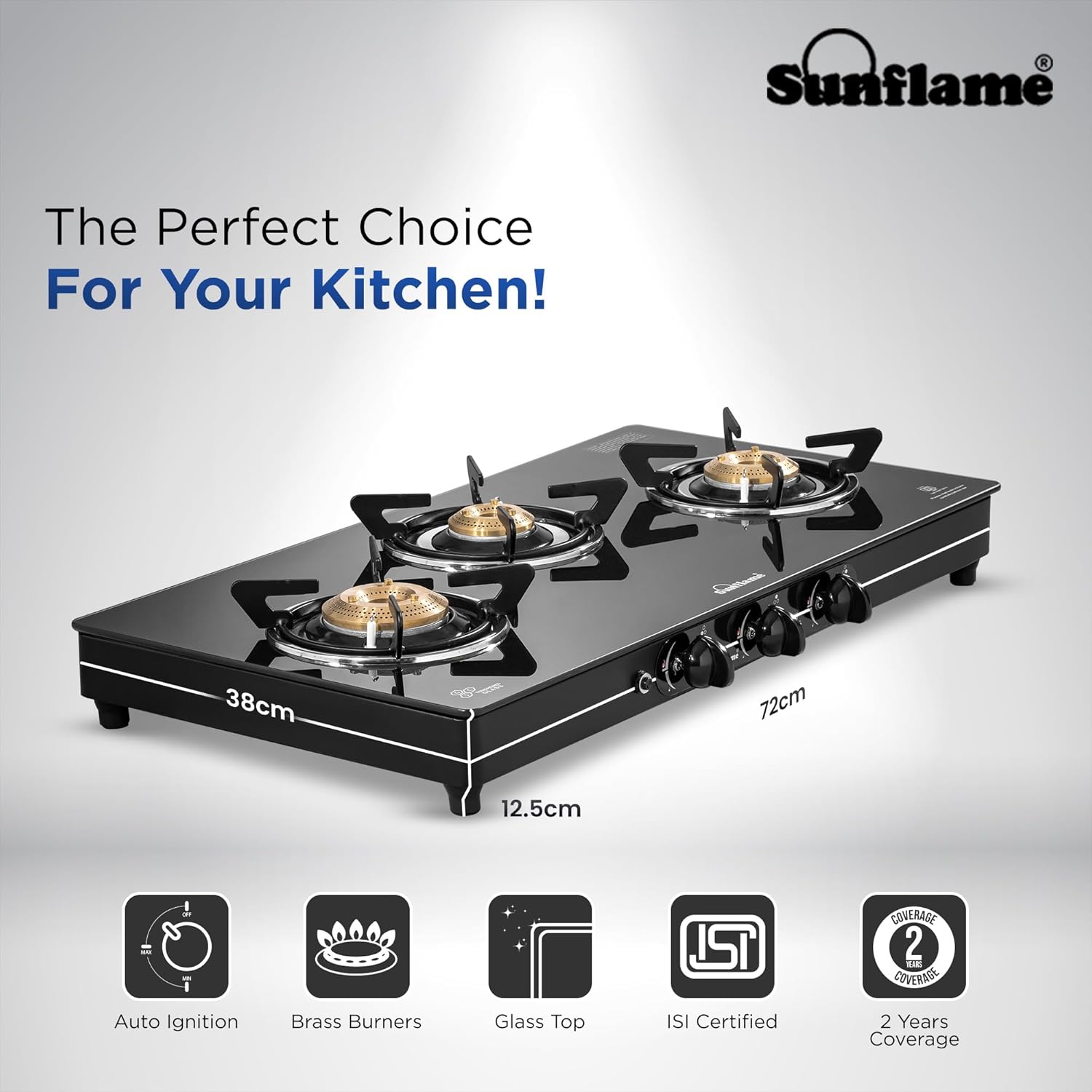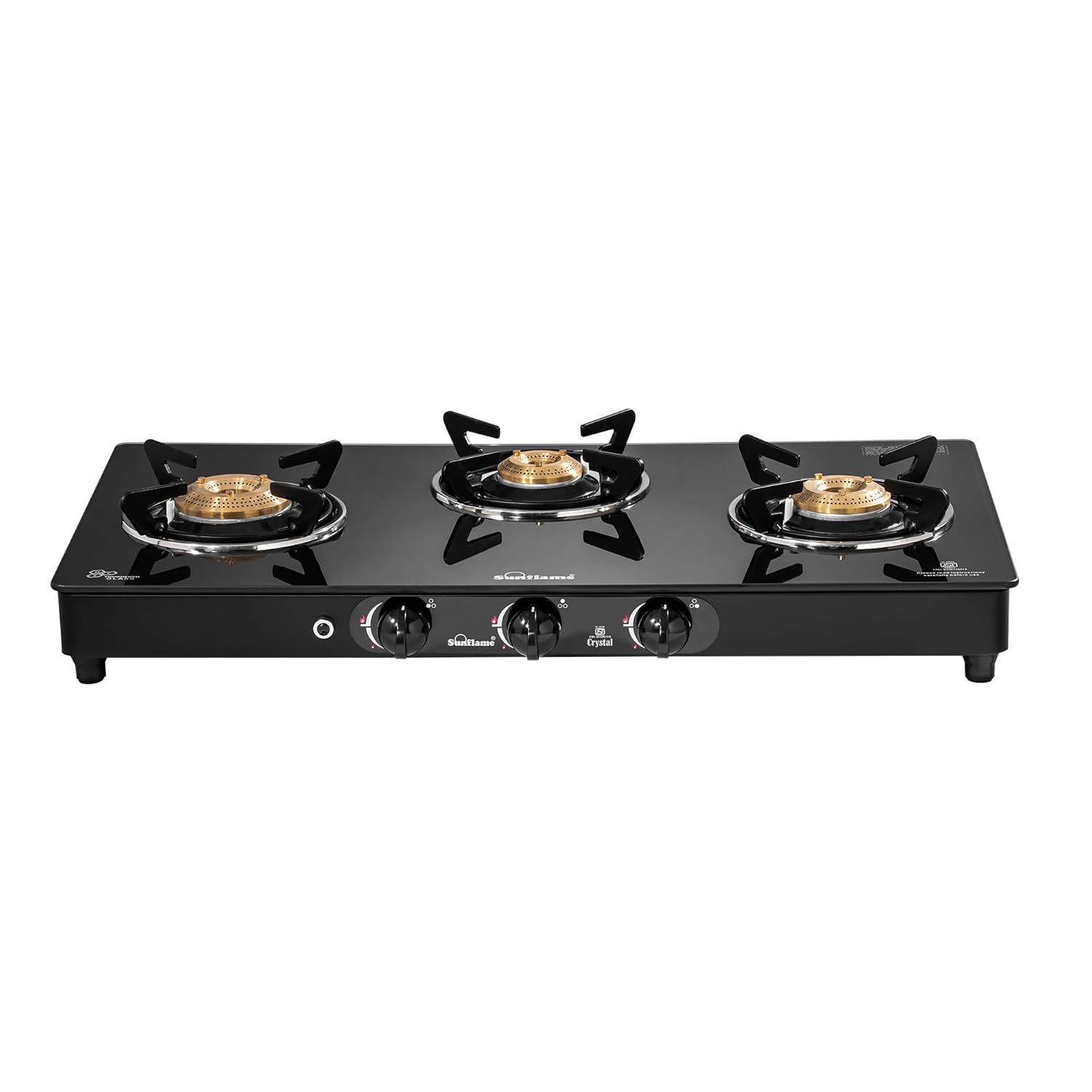 Sunflame, a trusted Indian kitchen appliance brand, offers a Crystal 3 Burner Gas Stove with a wide-body design, allowing faster cooking with multiple pots and higher temperatures. The jumbo brass burner efficiently uses fuel, reducing consumption. The black gas stove features heat-resistant nylon knobs for a comfortable grip and precise flame control. It has auto ignition, a premium glass finish, anti-skid legs, and an anti-leak brass gas valve for safety. The stove is ISI certified for quality and safety. The cooktop is protected by a powder-coated GP sheet, which is moisture-resistant and resistant to scratches, chips, and fading. Stainless steel drip trays prevent spills and clutter from reaching the burner or countertop. Sunflame provides a 2-year home service warranty. This reliable and stylish gas stove enhances your cooking experience.