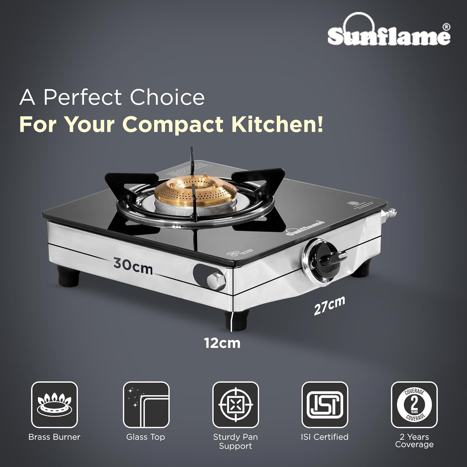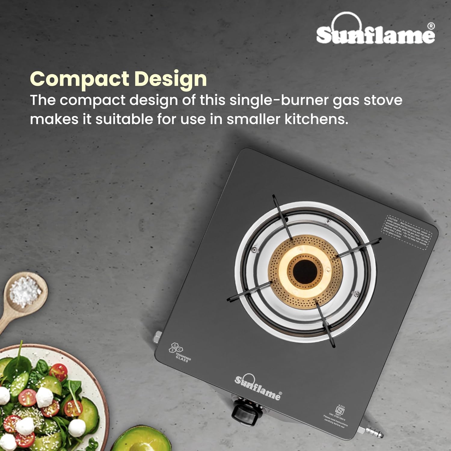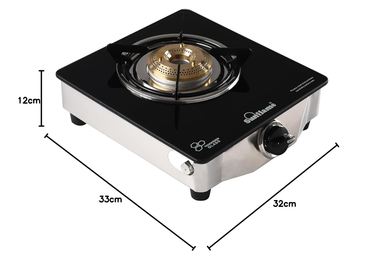The Sunflame One Burner Glass Top Gas Stove features an elegant design, a jumbo brass burner, and is ISI Certified LPG. It offers a secure cooking environment with anti-skid legs, and operates manually with a lighter or matchstick. The stove emits low CO2 and is environmentally friendly, promoting sustainability and improving indoor air quality. It comes with a 2-year manufacturer warranty.