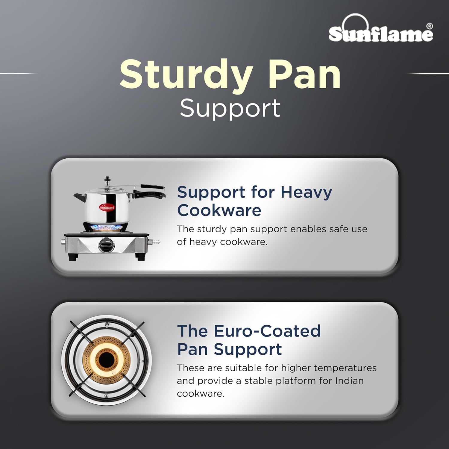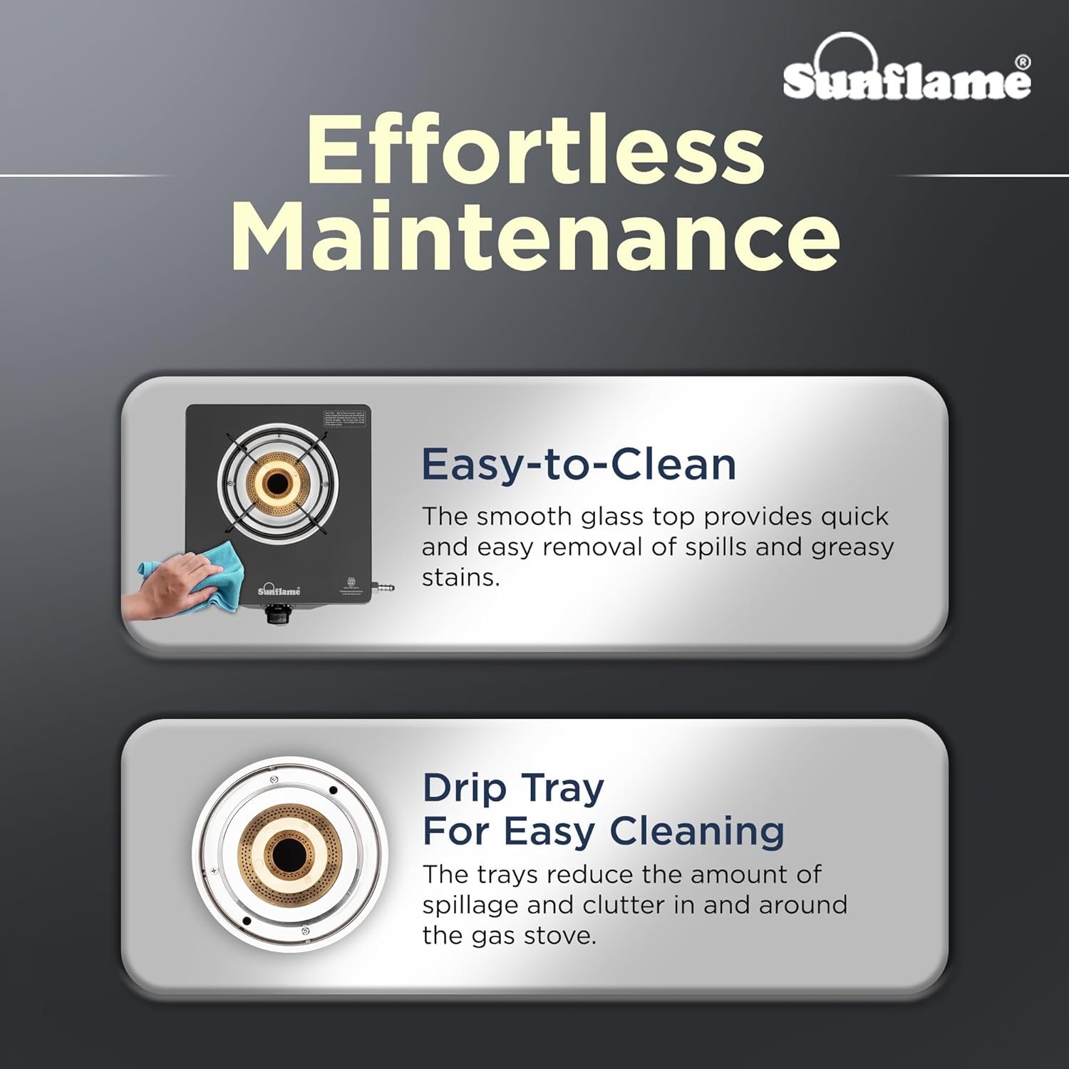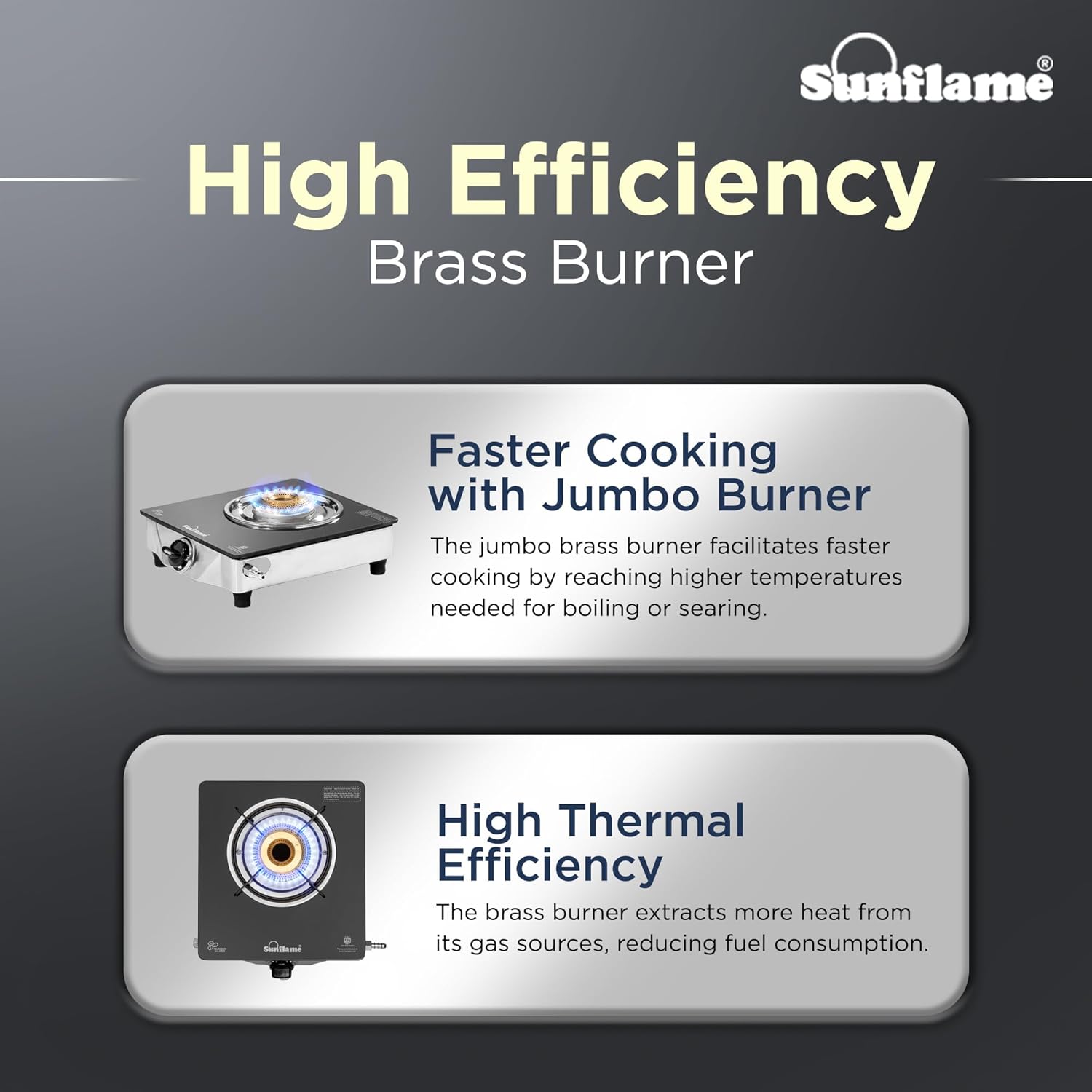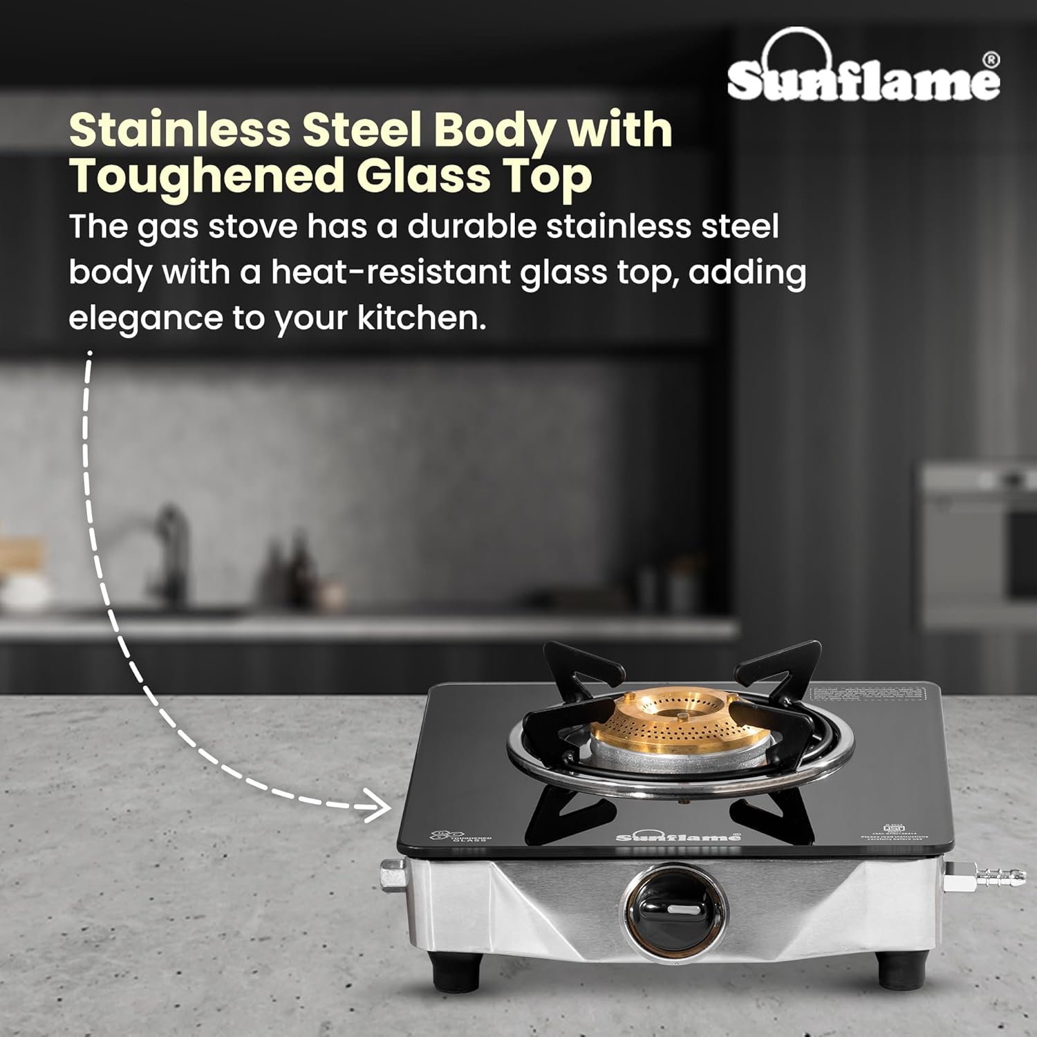The Sunflame One Burner Glass Top Gas Stove features an elegant design, a jumbo brass burner, and is ISI Certified LPG. It offers a secure cooking environment with anti-skid legs, and operates manually with a lighter or matchstick. The stove emits low CO2 and is environmentally friendly, promoting sustainability and improving indoor air quality. It comes with a 2-year manufacturer warranty.