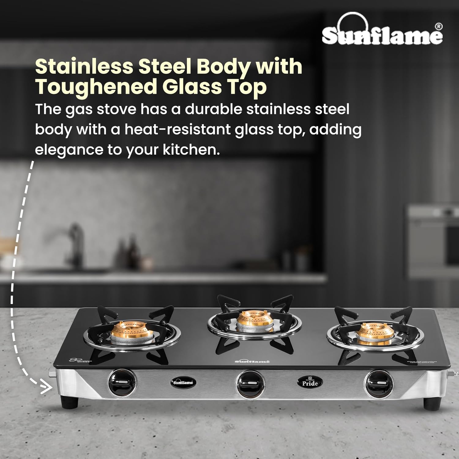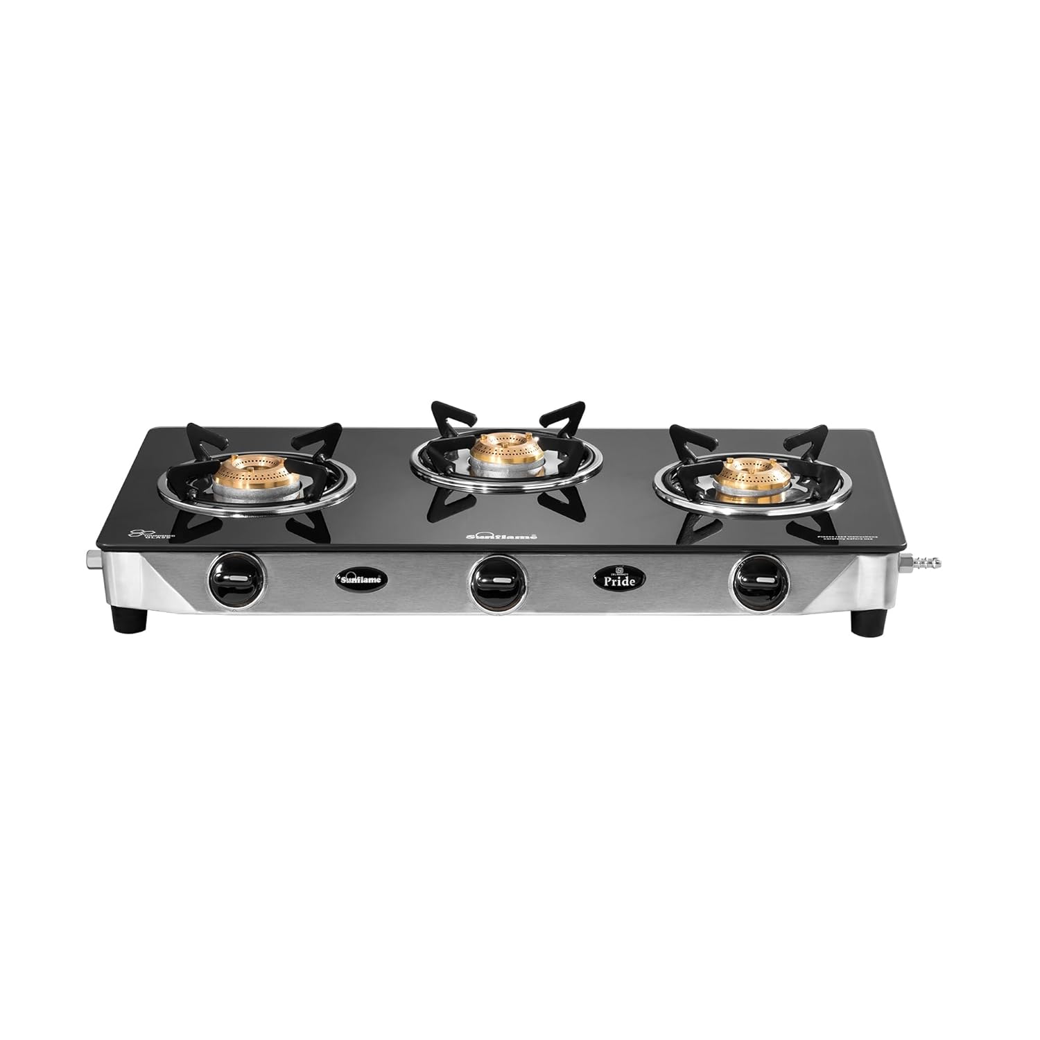 Pride 3 Burner Gas Stove | 1 Medium and 2 Small Brass Burners |Toughened Glass Top |Steel