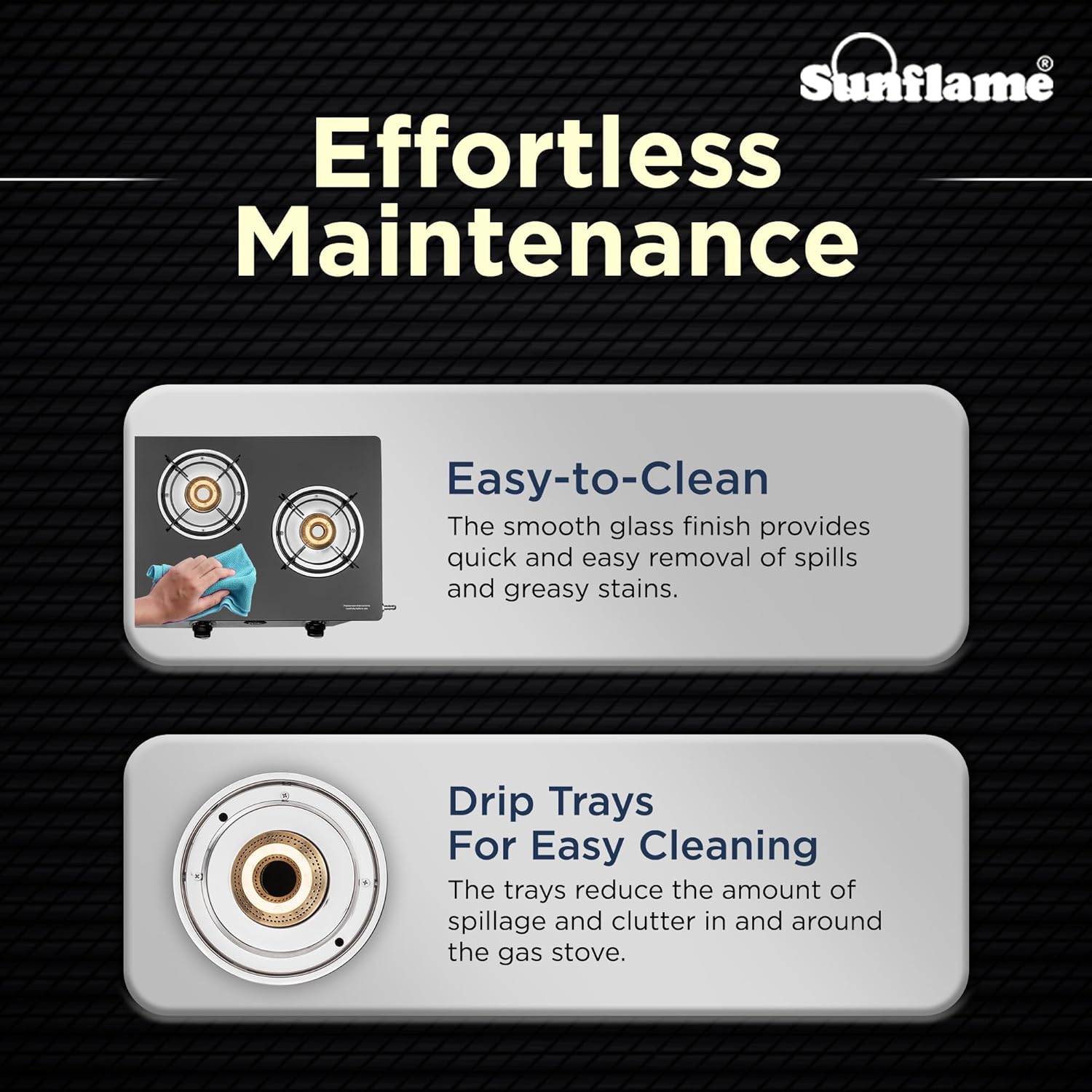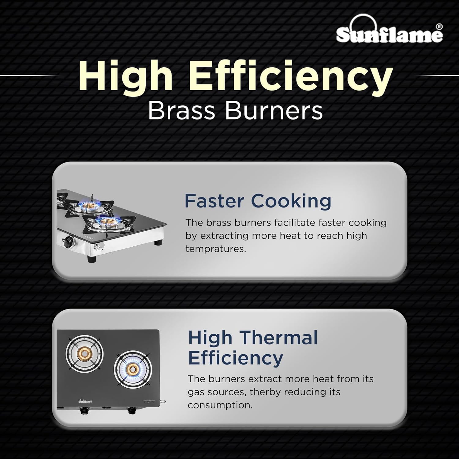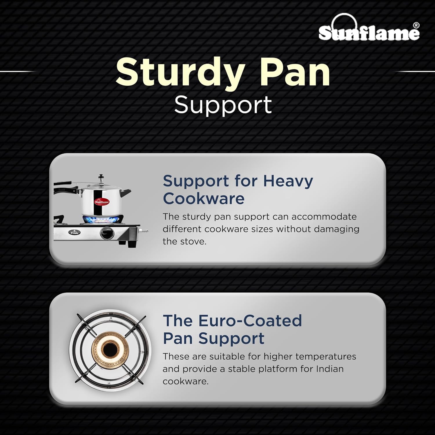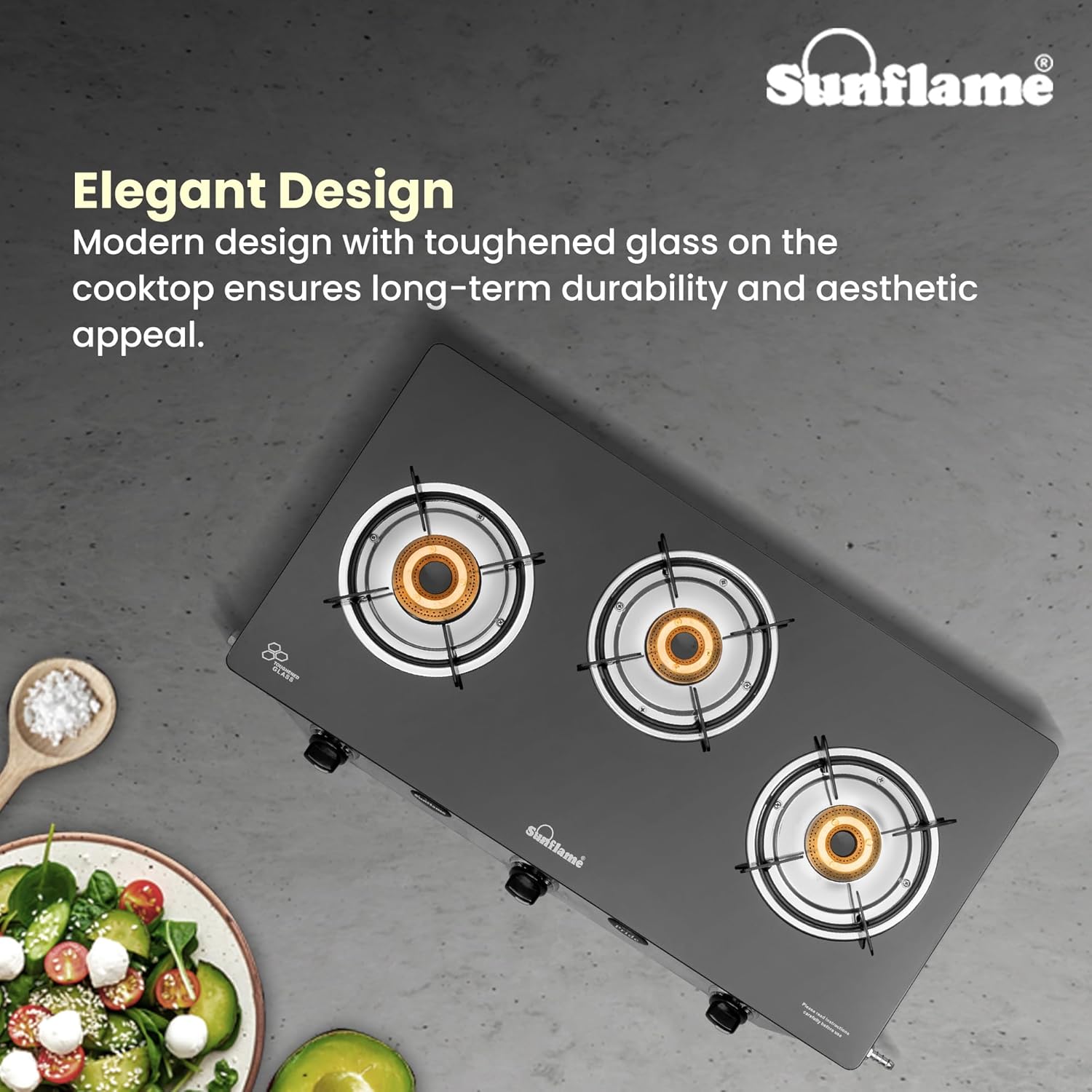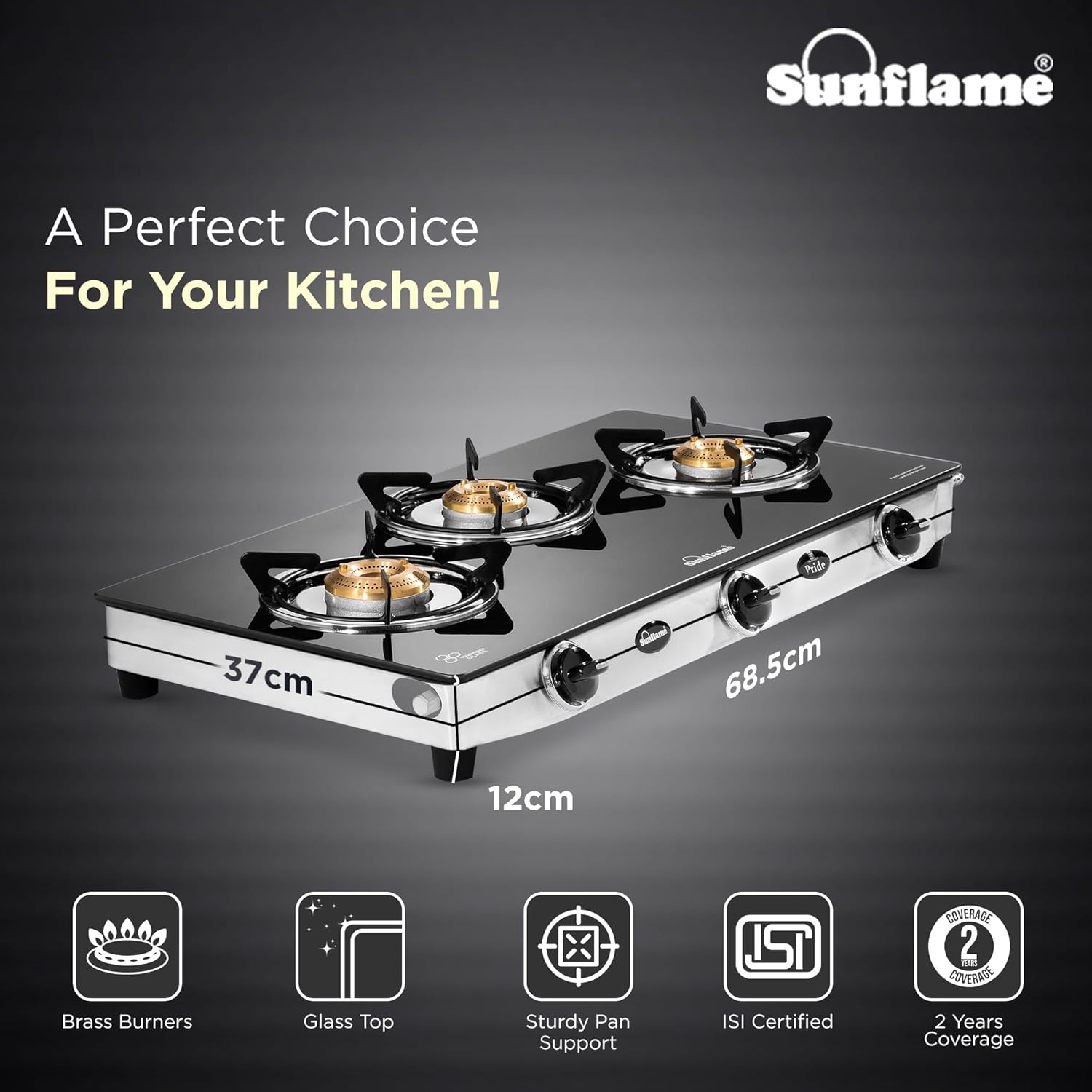 The Sunflame Pride 3 Burner Gas Stove is a stylish and durable stove with a high-quality glass top, heat-resistant nylon knobs, and ISI certification for LPG use. It offers easy flame intensity adjustment and is covered by a 2-year warranty. The stove features anti-skid legs for secure cooking and requires manual ignition. It also emits low CO2 levels, promoting environmental sustainability. The stove meets BIS standards for quality and durability. It also comes with a 2-year manufacturer warranty. This stove is perfect for any upscale kitchen.