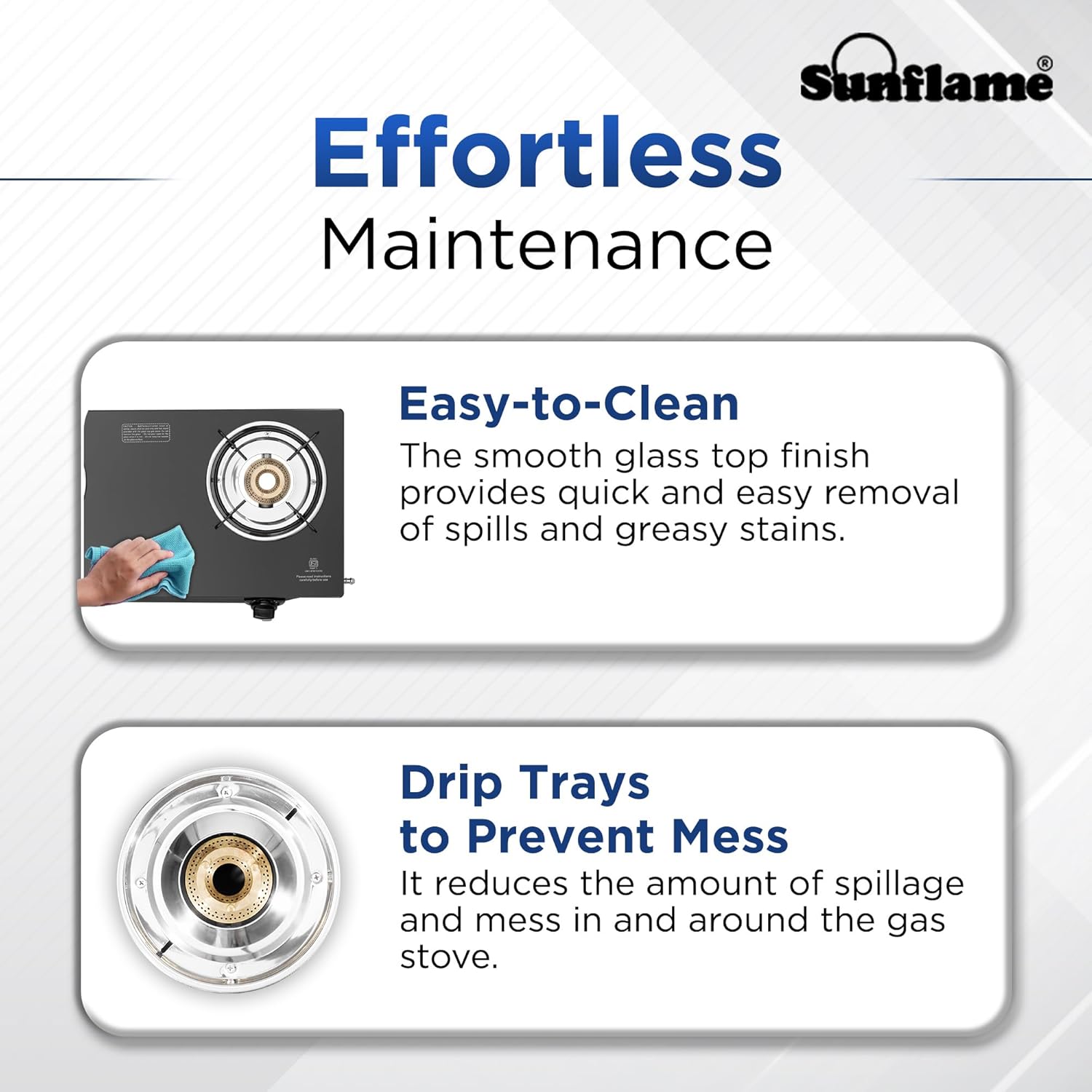 The Sunflame Maleo 2 Burner Gas Stove is a modern and space saving. It comes with a complimentary lighter and highly efficient brass burners, ensuring efficient use of fuel. The toughened glass top ensures durability and aesthetic appeal, while heat-resistant nylon knobs allow easy heat level adjustment. The stove is ISI certified for safety and meets BIS standards for LPG use. It comes with a comprehensive 2-year product coverage, including PAN India Doorstep service. The stove features sturdy anti-skid legs to prevent accidental slips and slides during cooking. It operates manually and requires a lighter or matchstick to ignite the flame.