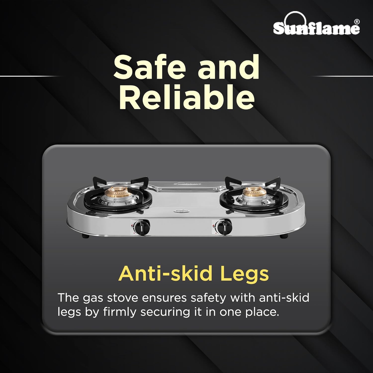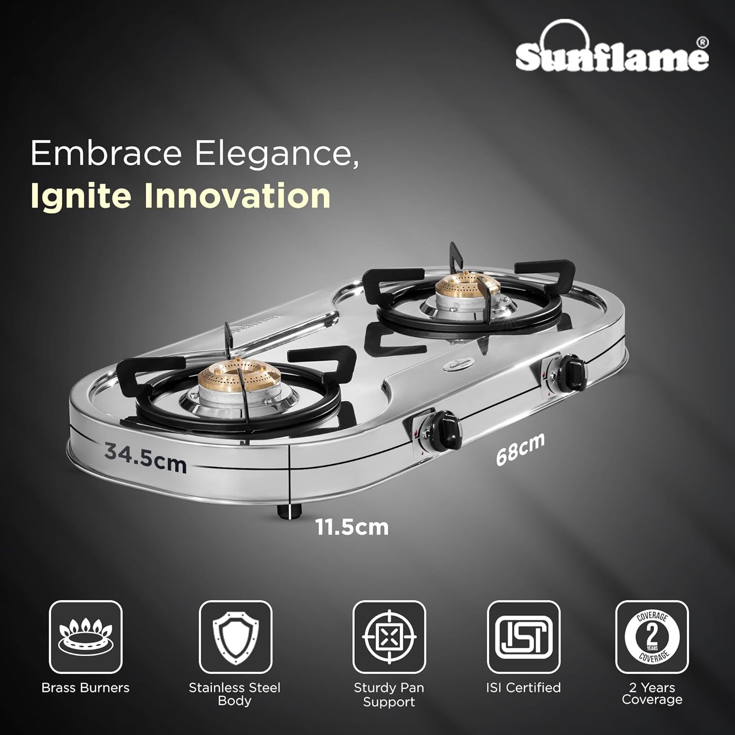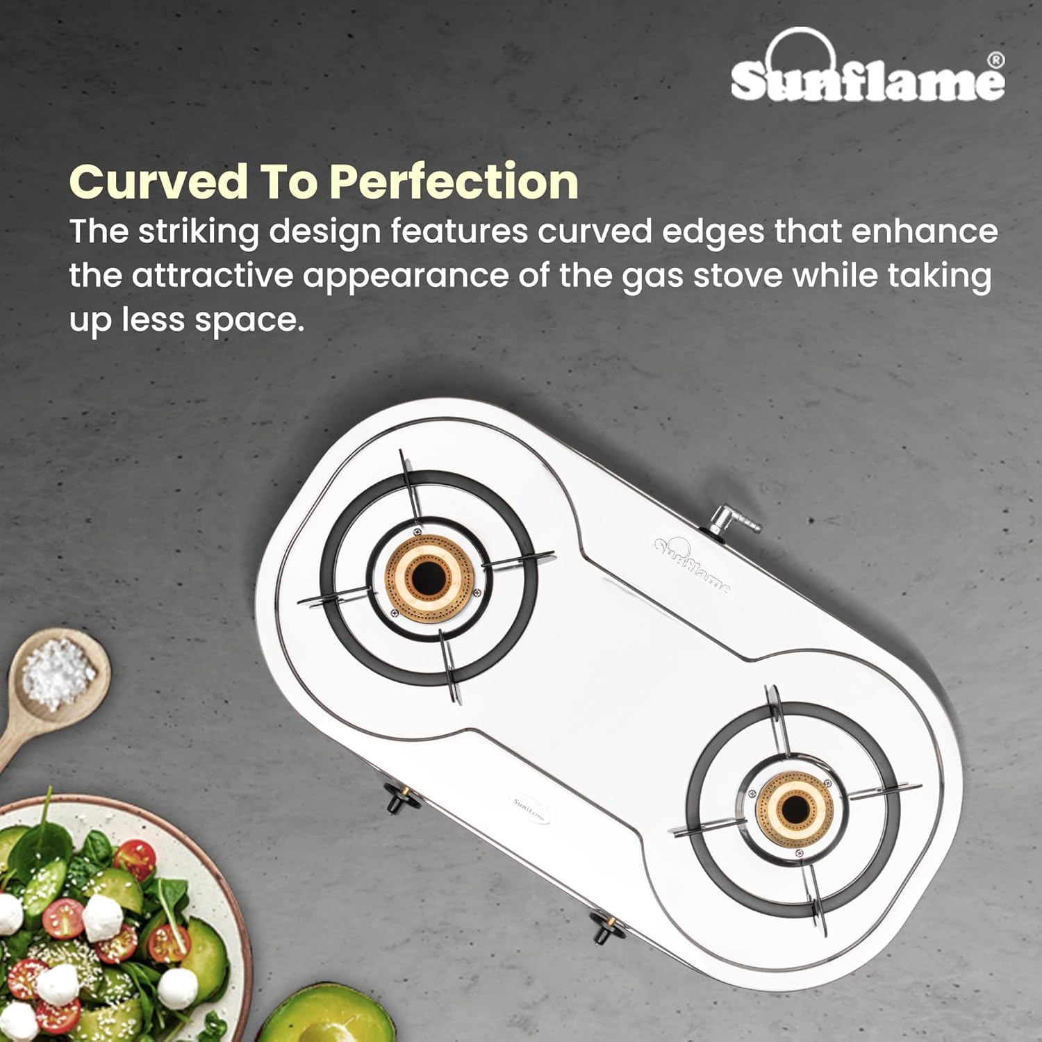 The Sunflame Optra 2 Burner Gas Stove is an elegant and compact stove that occupies less kitchen space. Its curved body is made of non-magnetic stainless steel, resistant to corrosion and scratches. The knobs are heat-resistant nylon, making it easy to adjust heat levels. The stove is safety certified with ISI, adhering to BIS standards for LPG usage. It comes with a two-year warranty, including Pan India Doorstep Services. The stove features anti-skid legs for secure cooking and requires manual ignition. It also emits minimal CO2 . The stove comes with a two-year manufacturer warranty.