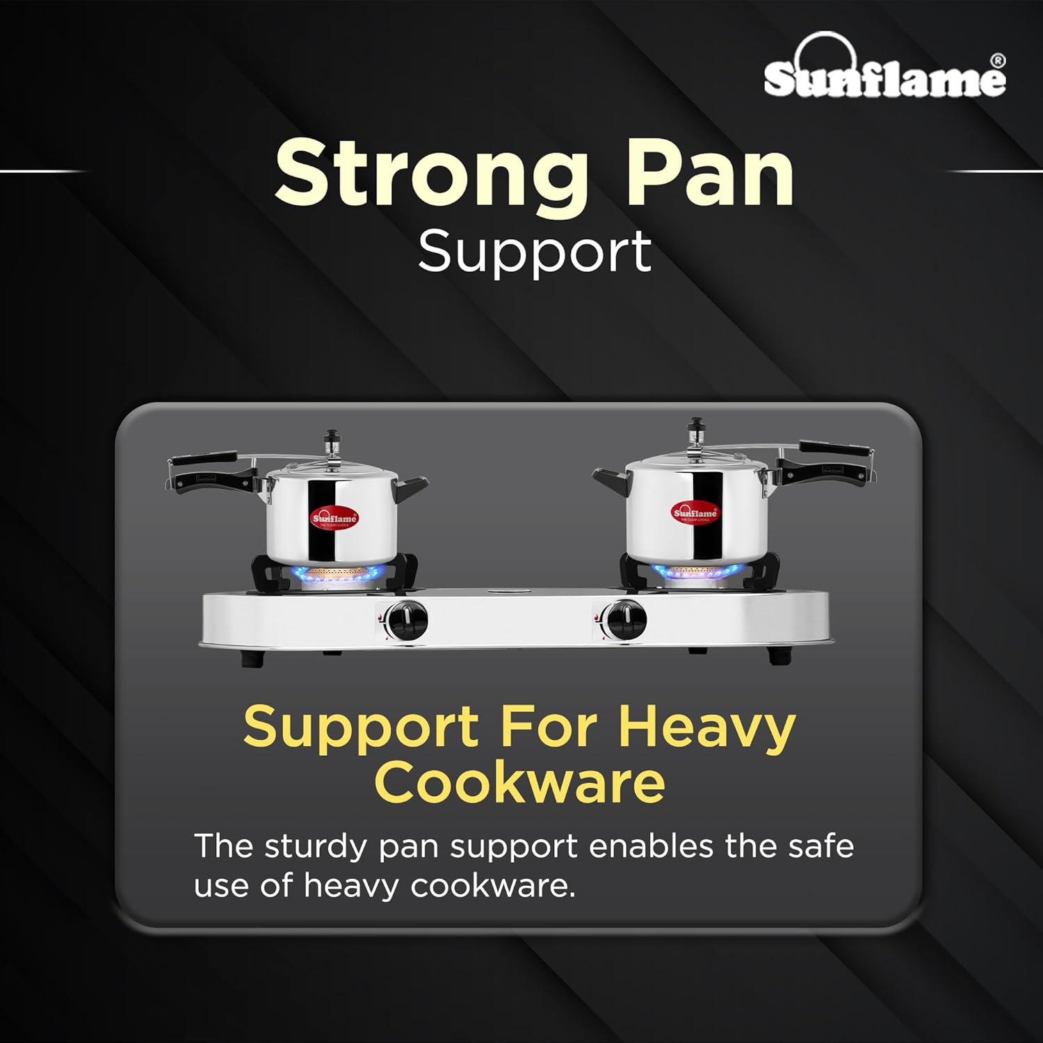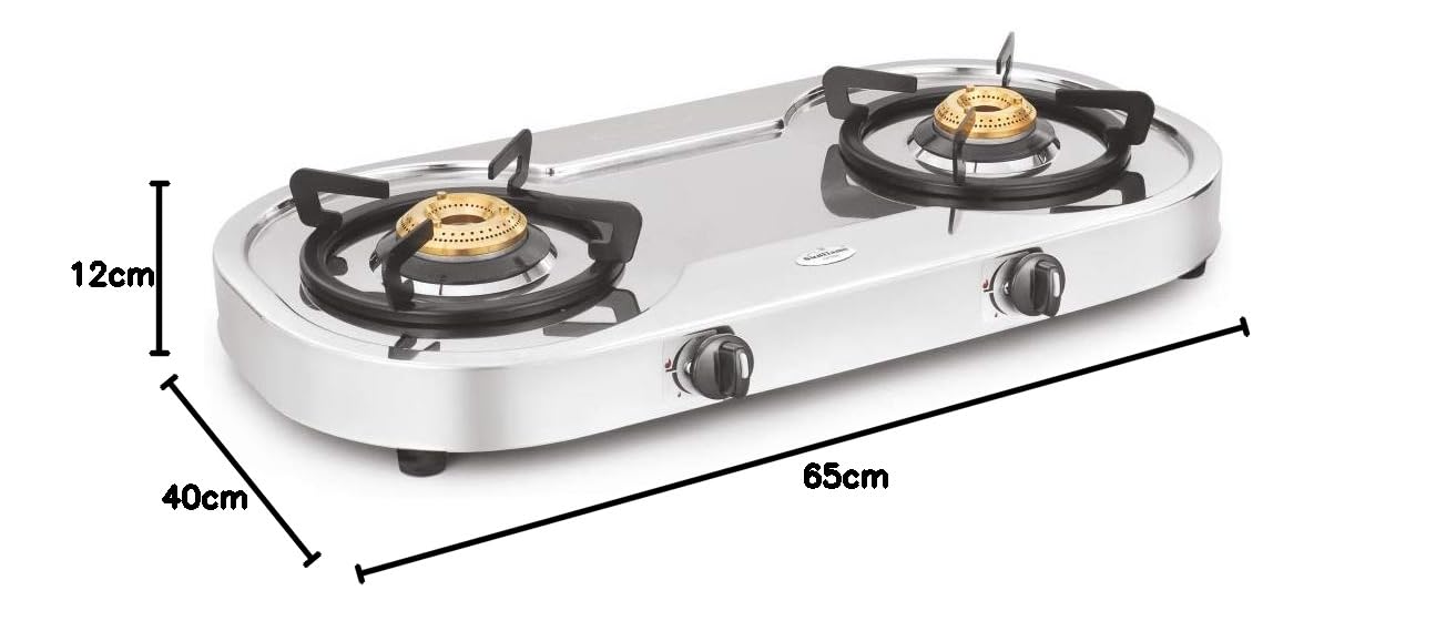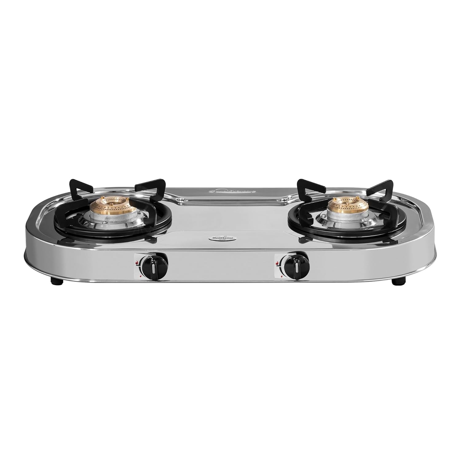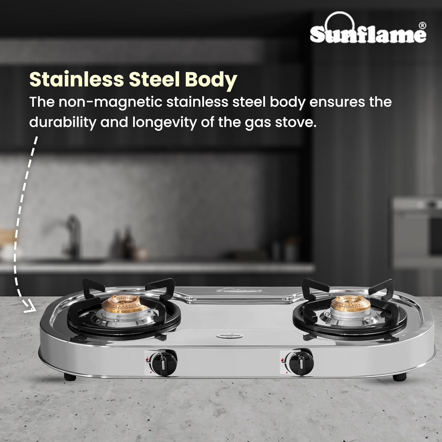 The Sunflame Optra 2 Burner Gas Stove is an elegant and compact stove that occupies less kitchen space. Its curved body is made of non-magnetic stainless steel, resistant to corrosion and scratches. The knobs are heat-resistant nylon, making it easy to adjust heat levels. The stove is safety certified with ISI, adhering to BIS standards for LPG usage. It comes with a two-year warranty, including Pan India Doorstep Services. The stove features anti-skid legs for secure cooking and requires manual ignition. It also emits minimal CO2 . The stove comes with a two-year manufacturer warranty.
