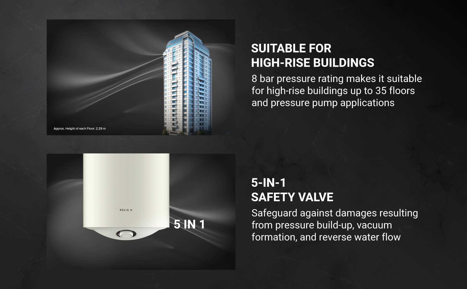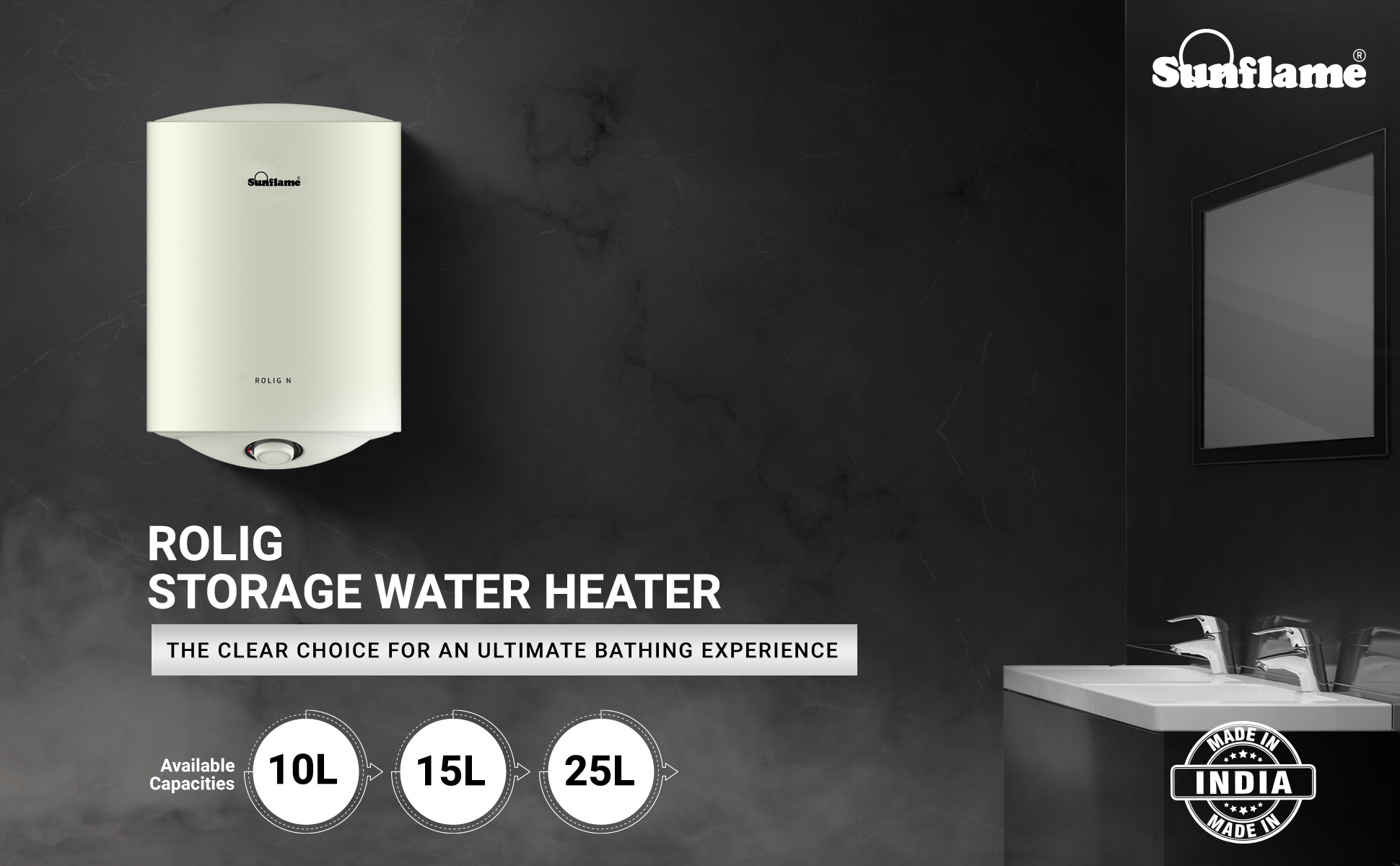 Your wait for the perfect hot shower ends here. Sunflame brings to you Roilg N Water Heaters, which offer long-lasting durability, ultimate safety, higher energy savings, and give your bathroom a classy distinctive touch. Its high density PUF insulation maximizes heat retention and ensures that the water inside the tank remains heated for a longer duration, thereby bringing down energy consumption and saving money. Its ability to withstand water pressure up to 8 bar also makes it an ideal choice for people residing in high-rise buildings or using pressure pumps. Built with state-of-the-art features such as Vitreous Enamel Coating, Magnesium Sacrificial Anode, highly superior Anti-rust Incoloy 800 Heating Element, and Single Weld Line Design, Sunflame's Rolig works well even with hard water and offers increased and prolonged resistance to rust, corrosion, and leakage. This makes the water heater last long and consistently deliver the same superior performance for years. It also safeguards against damages resulting from overheating, pressure build-up and vacuum formation with its host of pre-emptive safety features like the thermostat, thermal cut-off and pressure release valve. With four capacity variants of 10L, 15L and 25L, this vertical storage water heater comes with a highly convenient temperature control knob and stylish neon indicators for power and heating status. Note: Free installation and free inlet/outlet connection pipes are not provided for the Rolig Series.