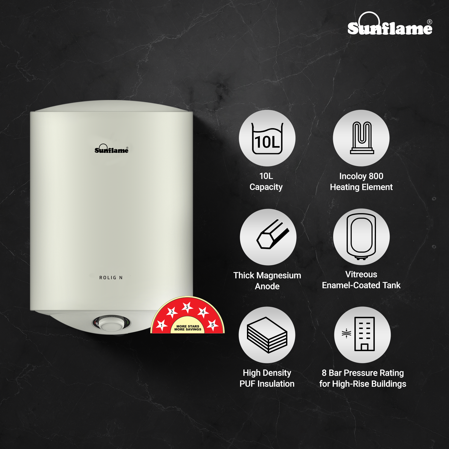 Sunflame Rolig N Geyser 10 Litre Wall Mount Water Heater for Home | 5 Star Rating | Vitreous Enamel Tank Coating | Advanced Multi-layered Safety | Suitable for Hard Water & High-rise Buildings | White