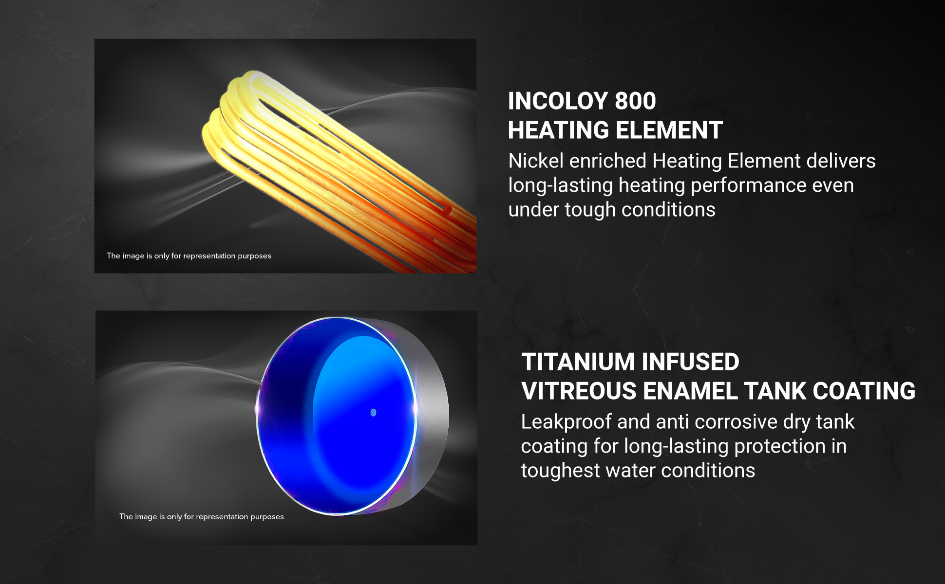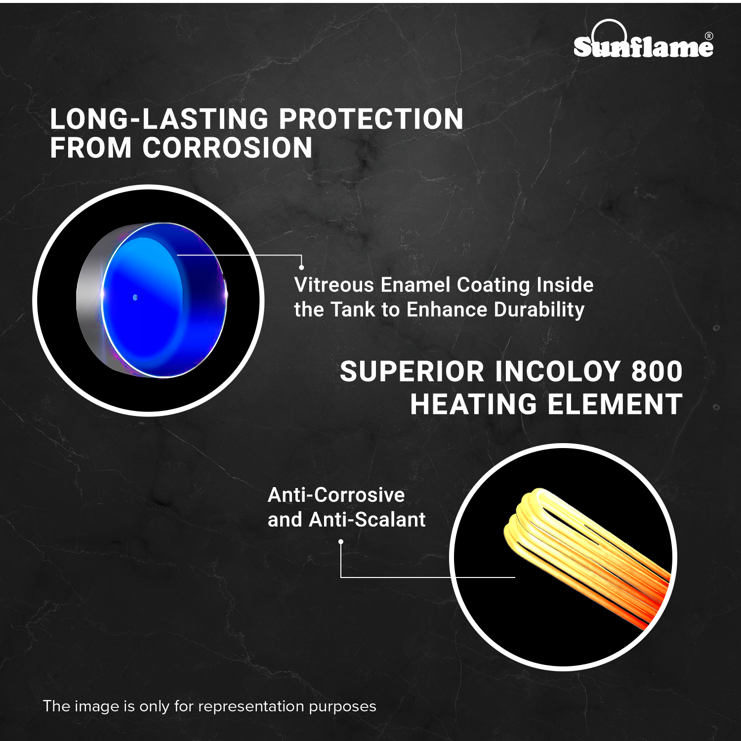 Built with state-of-the-art features such as Vitreous Enamel Coating, Magnesium Sacrificial Anode, highly superior Anti-rust Incoloy 800 Heating Element, and Single Weld Line Design, Sunflame's Rolig works well even with hard water and offers increased and prolonged resistance to rust, corrosion, and leakage. This makes the water heater last long and consistently deliver the same superior performance for years.