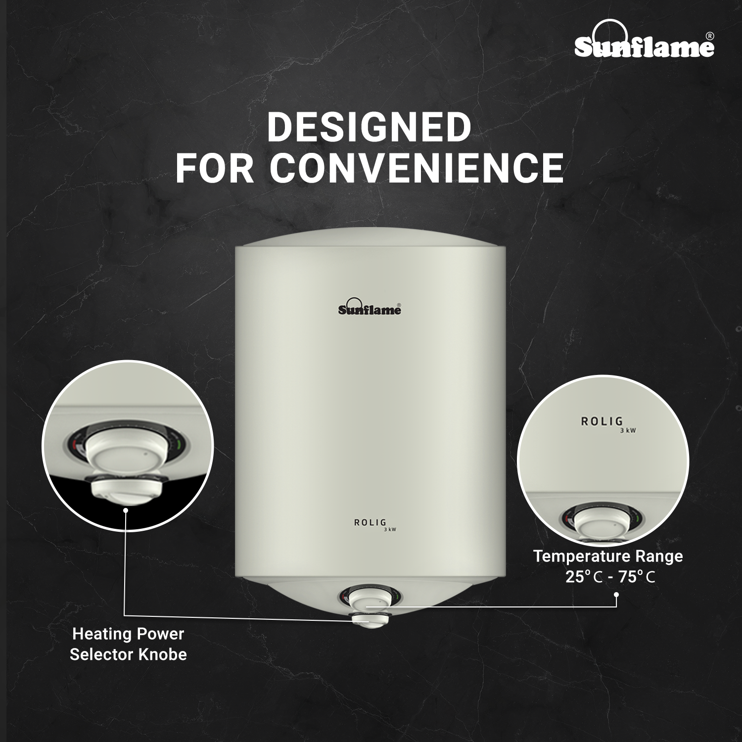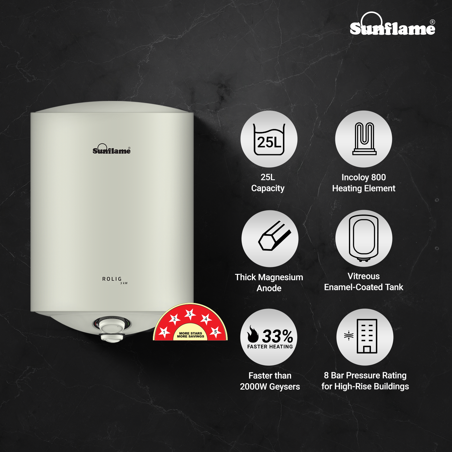 Sunflame Rolig 3kW Geyser 25 Litre Water Heater | 33% Faster Heating | Suitable for Hard Water | Energy Efficient 5 Star Rating | Advanced 4 layered Safety | 5 Year Inner Tank Warranty by Sunflame