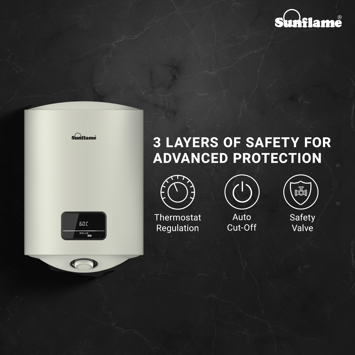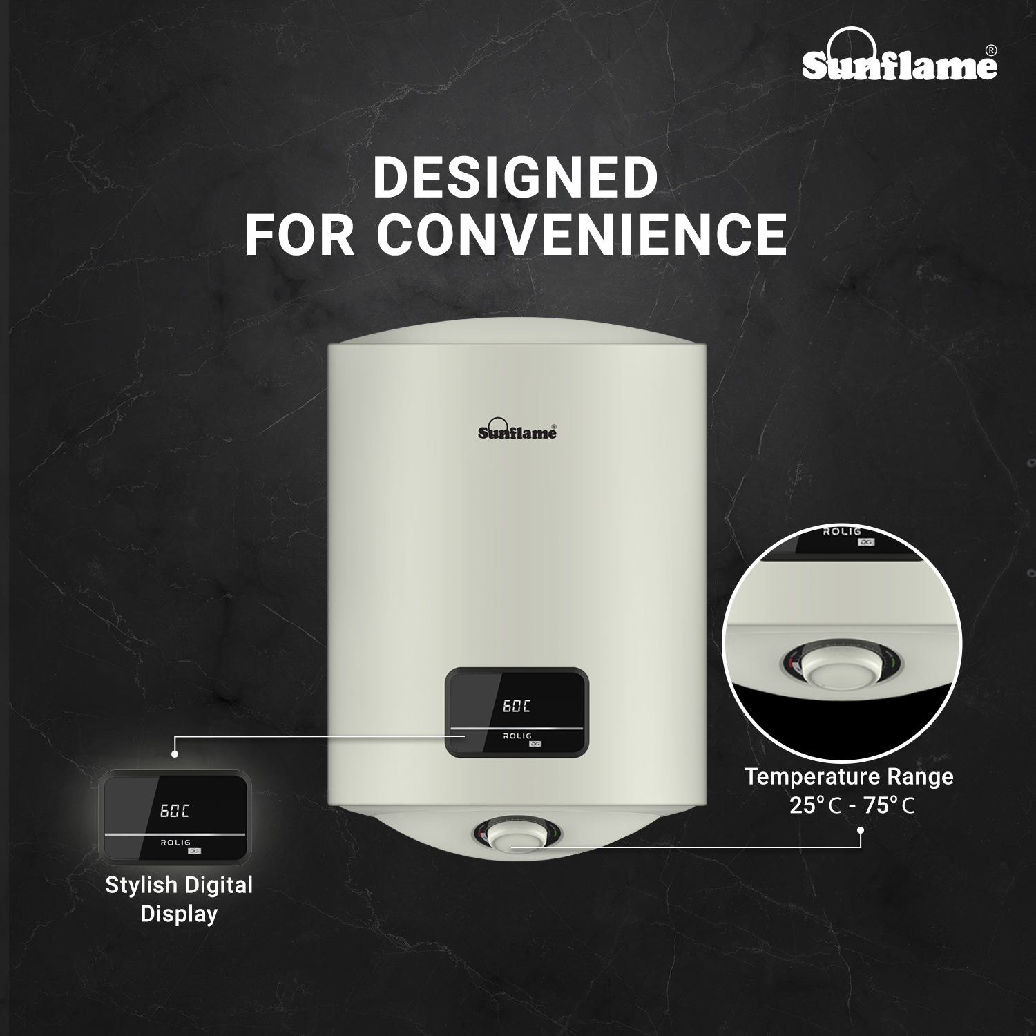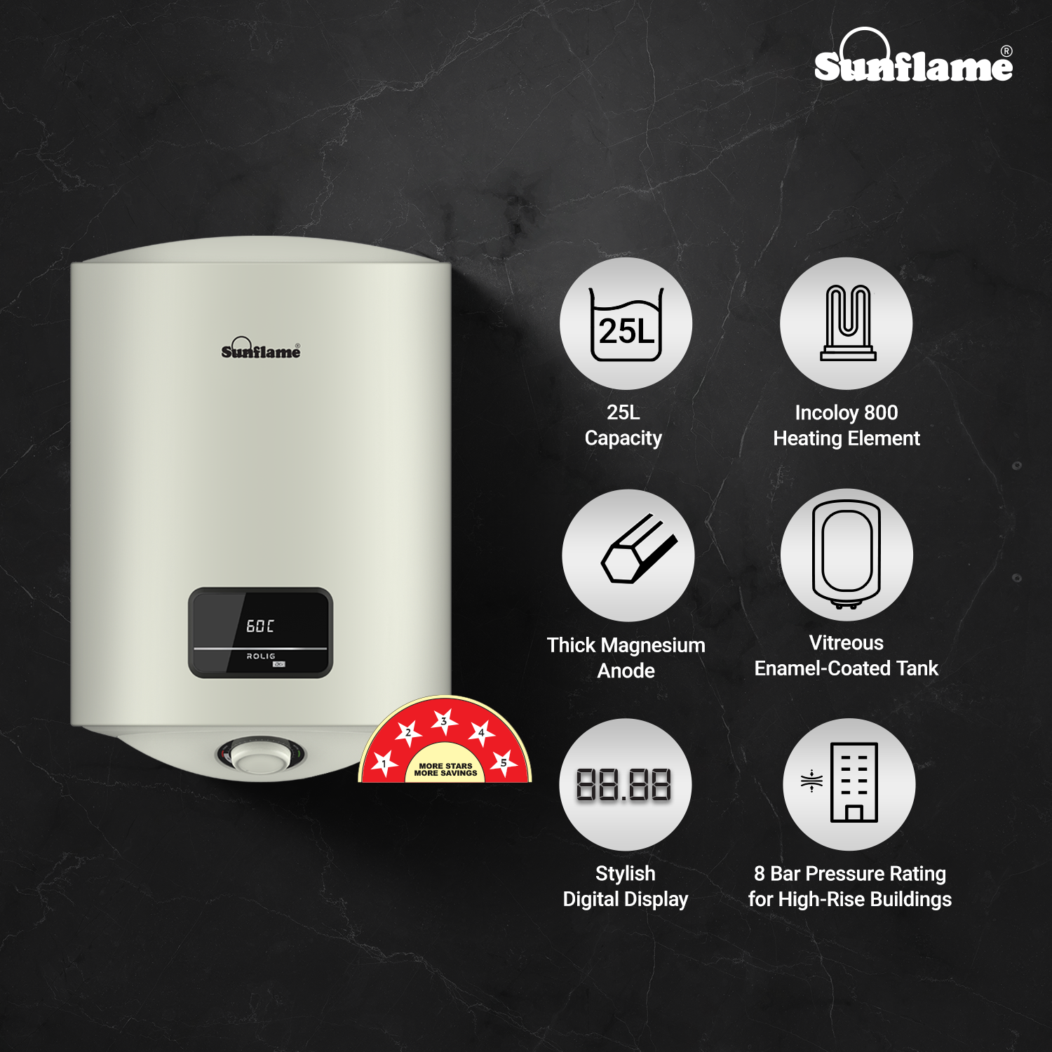 Sunflame Rolig DG Geyser 25 Litre Water Heater with Digital Display | Suitable for Hard Water | Energy Efficient 5 Star Rating | Advanced 4 layered Safety | 5 Year Inner Tank Warranty by Sunflame