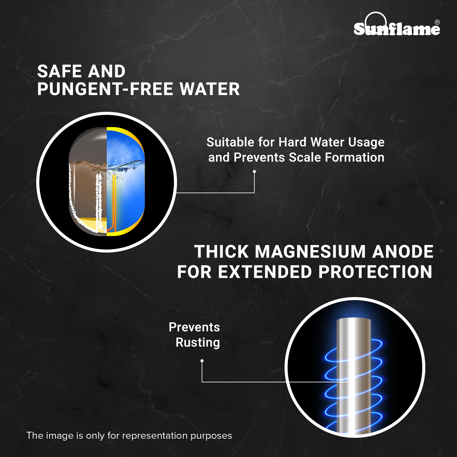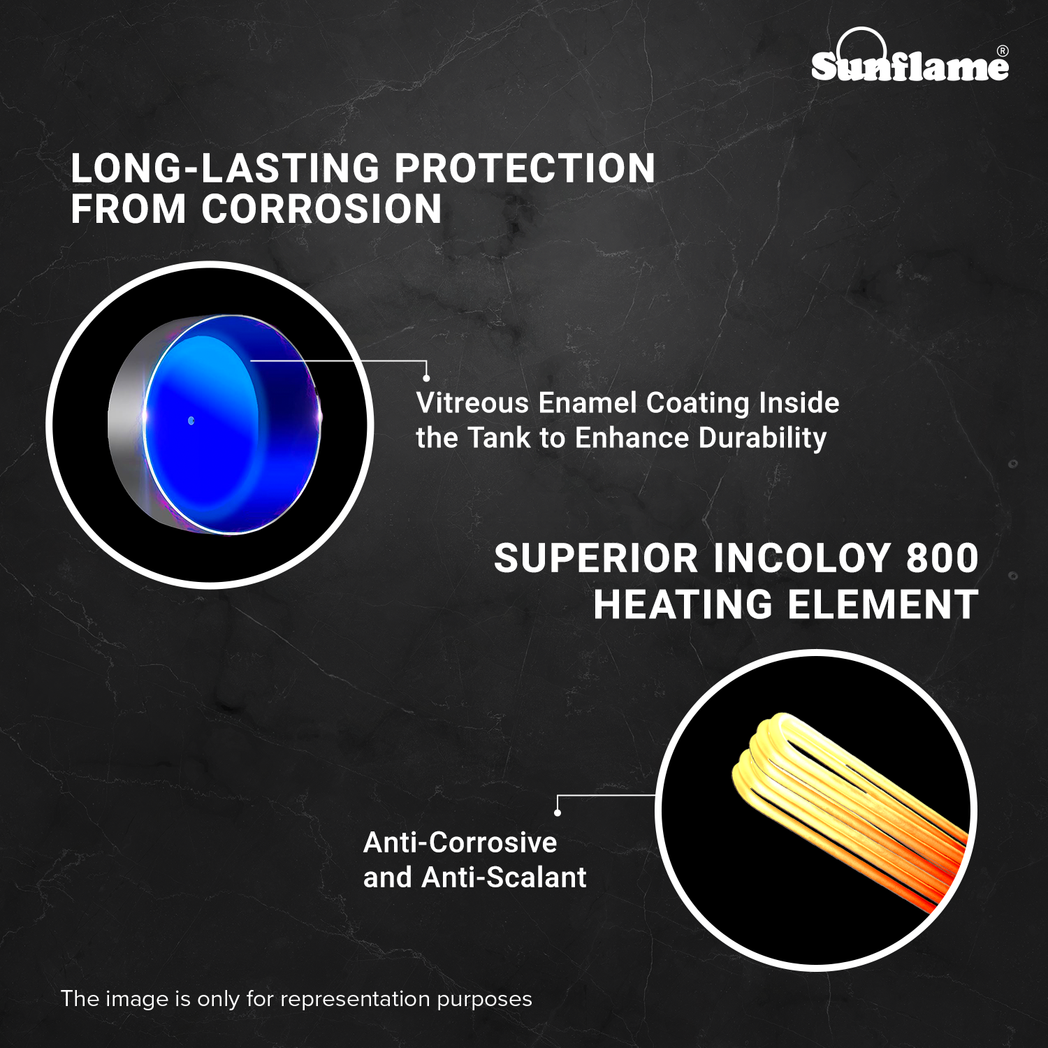 Built with state-of-the-art features such as Vitreous Enamel Coating, Magnesium Sacrificial Anode, highly superior Anti-rust Incoloy 800 Heating Element, and Single Weld Line Design, Sunflame's Rolig works well even with hard water and offers increased and prolonged resistance to rust, corrosion, and leakage. This makes the water heater last long and consistently deliver the same superior performance for years.