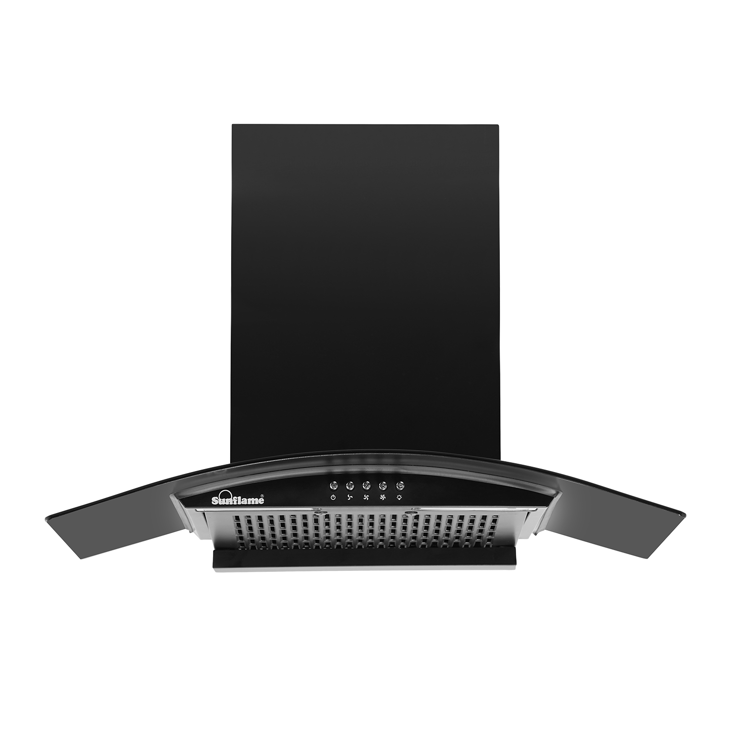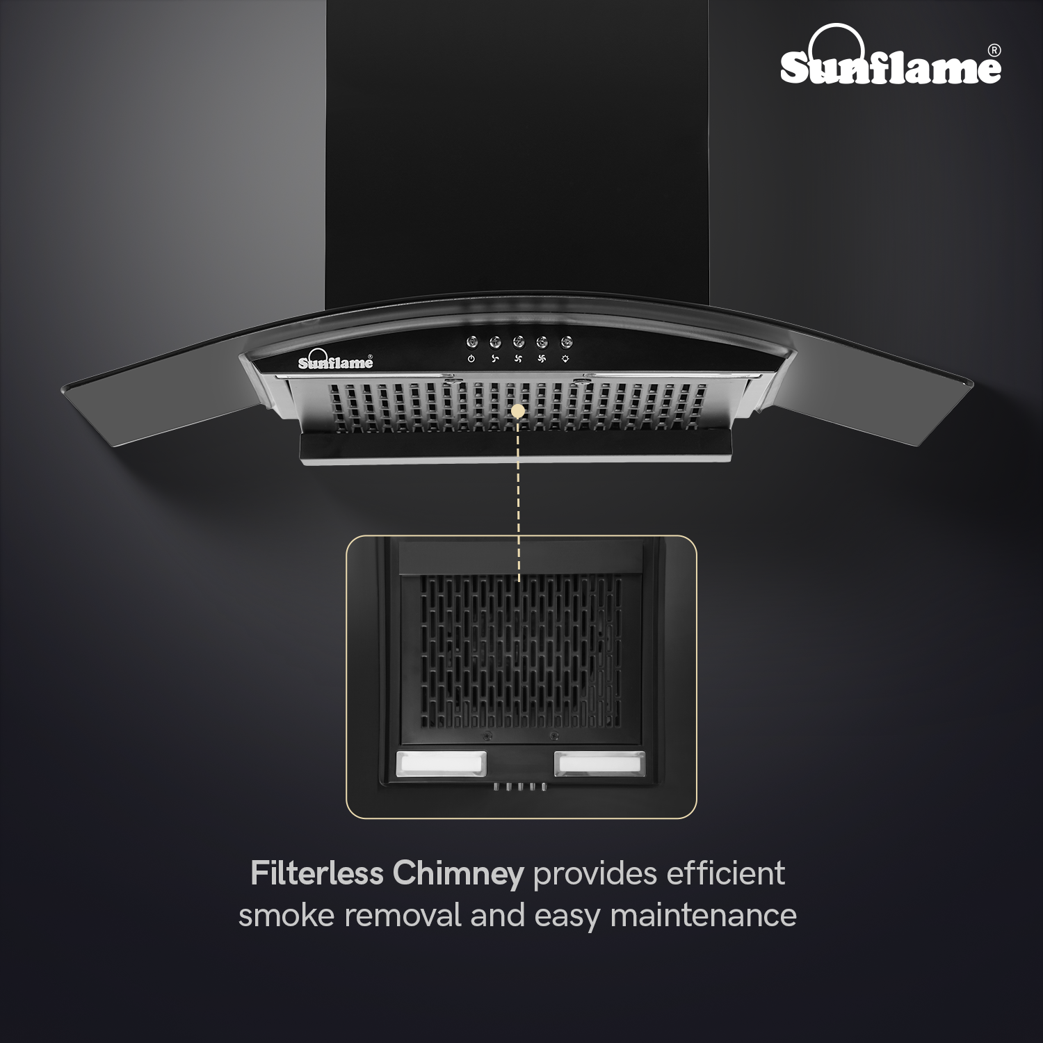 Introducing the Sunflame Naples Black Chimney – the perfect companion for any modern kitchen. This 60 cm wall-mounted chimney features an impressive 1100 m³/h high suction capacity, keeping your cooking area fresh and smoke-free. Equipped with advanced filterless technology, it eliminates smoke efficiently and makes maintenance effortless. The matte-black, powder-coated body is both stain- and rust-resistant, preserving its sleek look over time. Its curved, toughened glass not only enhances the aesthetic appeal but also improves smoke extraction by directing airflow efficiently. The chimney also comes with 3-speed exhaust fan settings, allowing you to adjust suction power as per your cooking needs—whether it's light sautéing or intense frying. Thoughtfully placed, energy-efficient dual LED lights illuminate the cooktop, while clearly labeled push buttons ensure ease of use. With 2 years of product warranty and 8 years on the motor, the Sunflame Naples Chimney offers complete peace of mind. Backed by a PAN-India service network and multiple direct service centers, it’s a reliable, durable, and long-lasting addition to your kitchen.