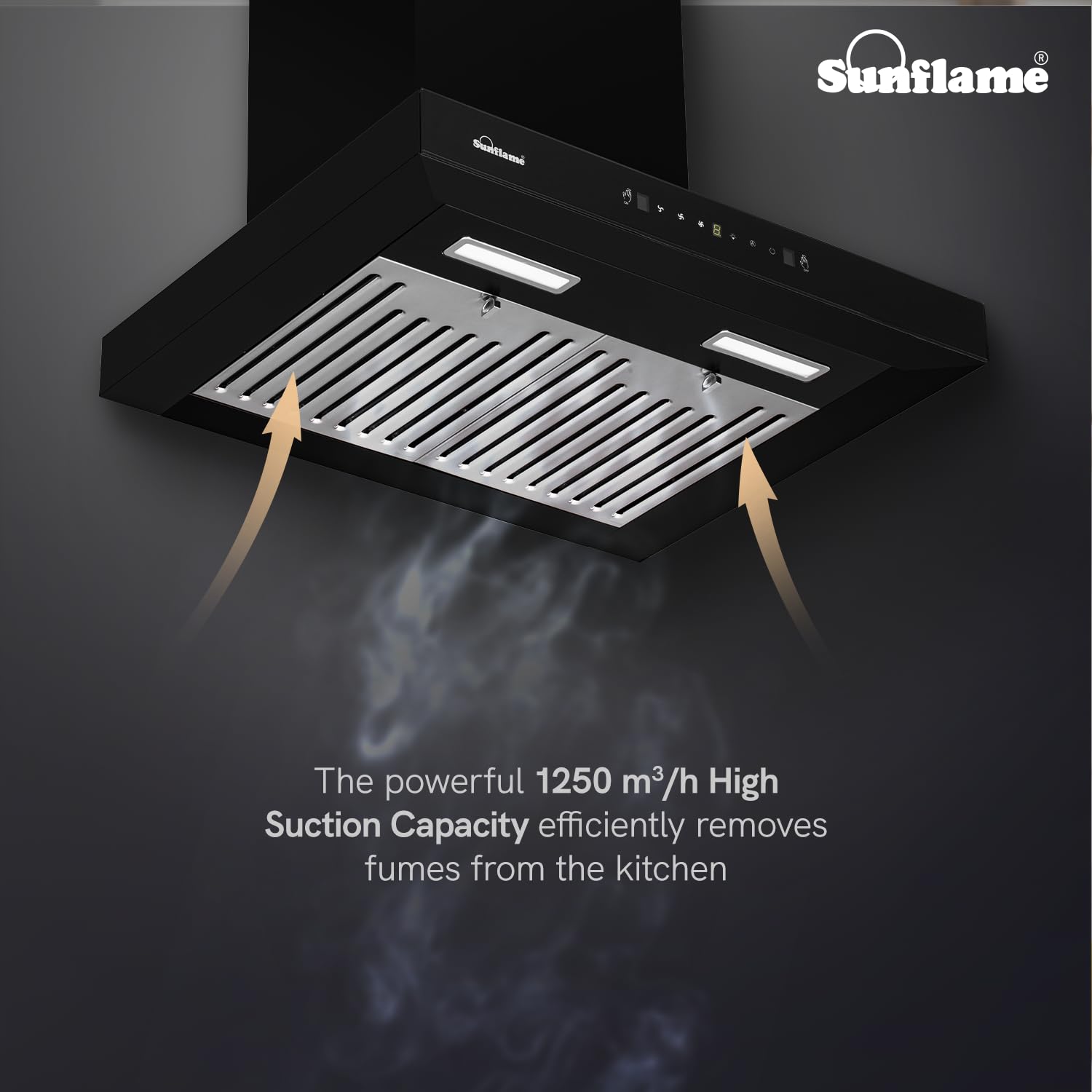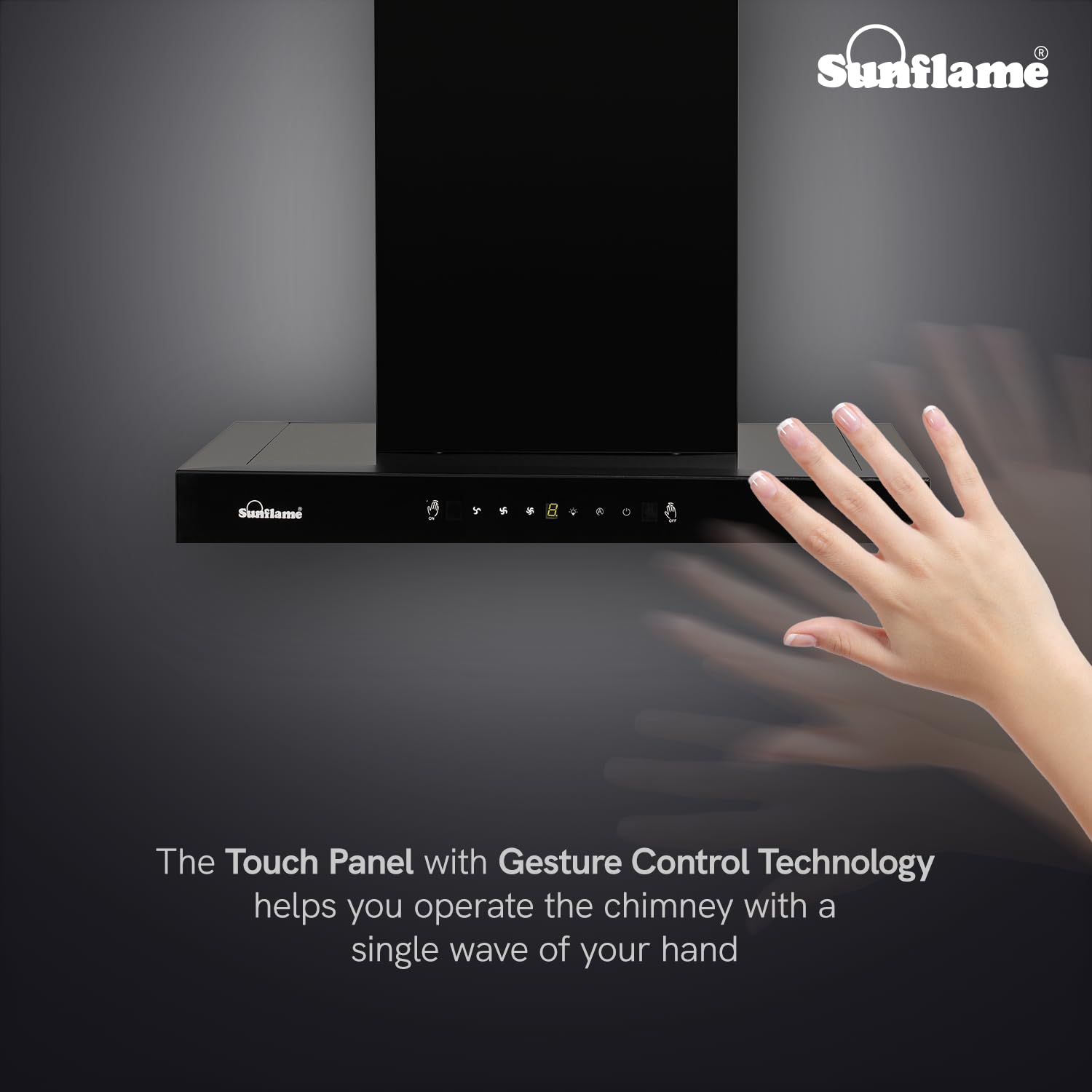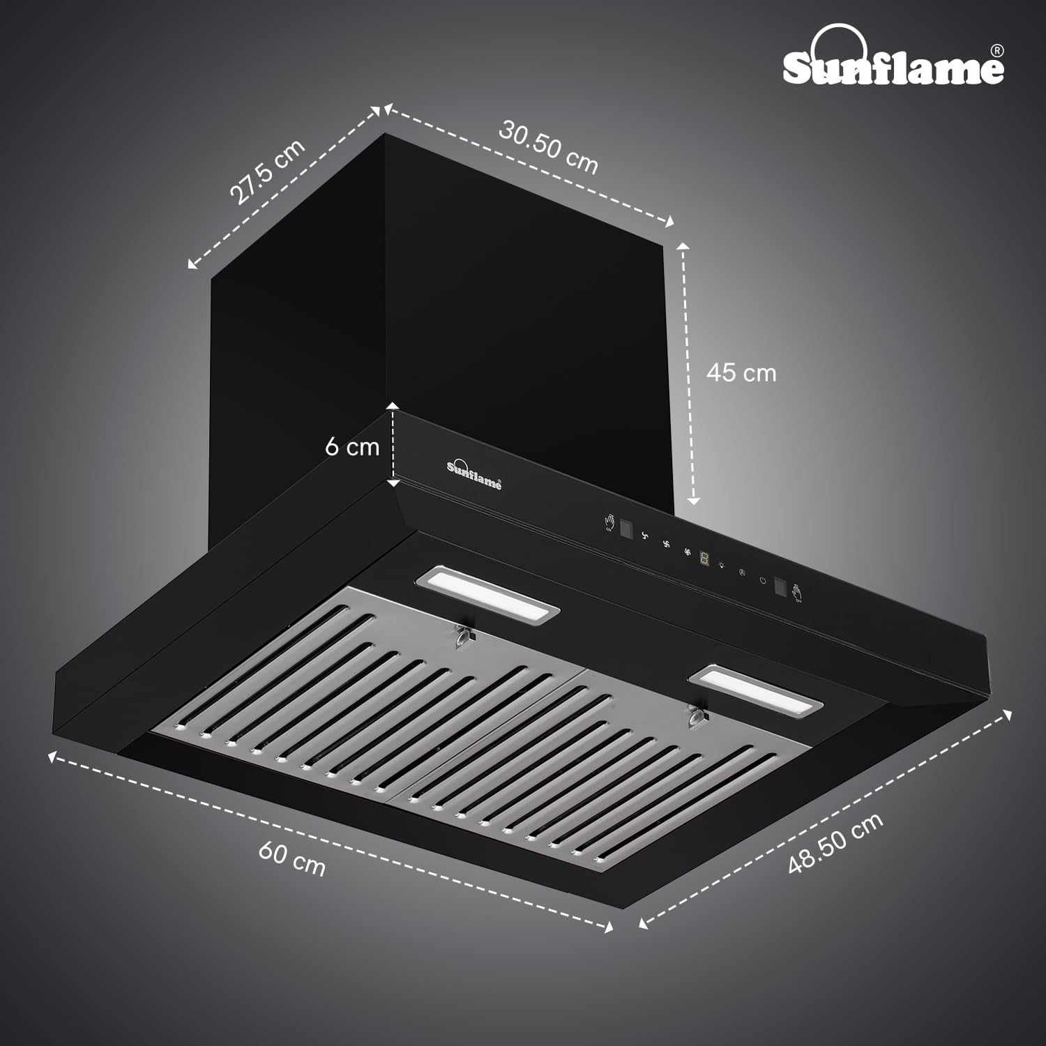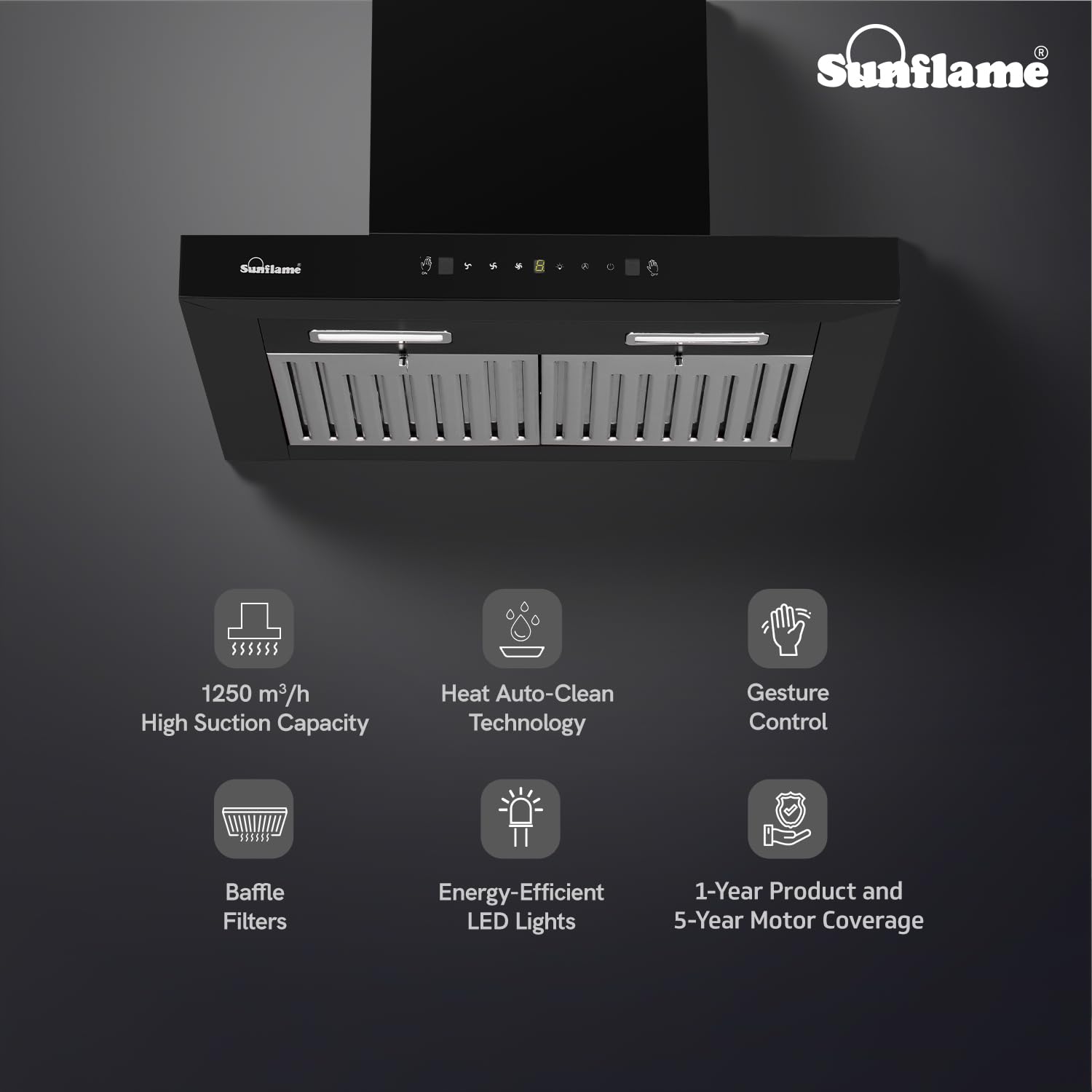 The Sunflame Lancer Chimney for Kitchen is a compact, 60cm-wide kitchen chimney that takes up minimal space while enhancing your kitchen’s interiors. It features a powerful motor with a high suction capacity of 1250 m³/h, making it the ideal chimney for kitchen use. Equipped with highly efficient stainless steel baffle filters, this chimney effectively traps smoke and airborne particles, ensuring a pleasant and smoke-free cooking environment. The smart touch heat auto-clean technology further adds to your convenience by melting away oil and grease deposits within the chimney, eliminating the need for frequent manual cleaning. Additionally, the chimney comes with a large-capacity, easily removable oil cup, reducing maintenance efforts and enhancing its longevity. Its 3-speed exhaust setting is designed to cater to various cooking needs, efficiently handling different levels of smoke and odor intensity, and keeping your kitchen hygienic and smoke-free regardless of the dish you’re preparing. The durable, heat-resistant body of this kitchen chimney boasts a sleek matte black finish, adding elegance to your kitchen interiors. Its wide coverage enhances its efficiency for maximum suction. The Sunflame Lancer chimney also features advanced gesture control technology, energy-efficient high-lumen LED lights, and a user-friendly touch panel for added convenience. With 1-year product coverage and a 5-year motor warranty, this chimney ensures peace of mind and reliable service. The PAN-India service network, multiple direct service centers, and dedicated customer care support make the Sunflame Lancer Chimney a dependable and durable addition to any kitchen.