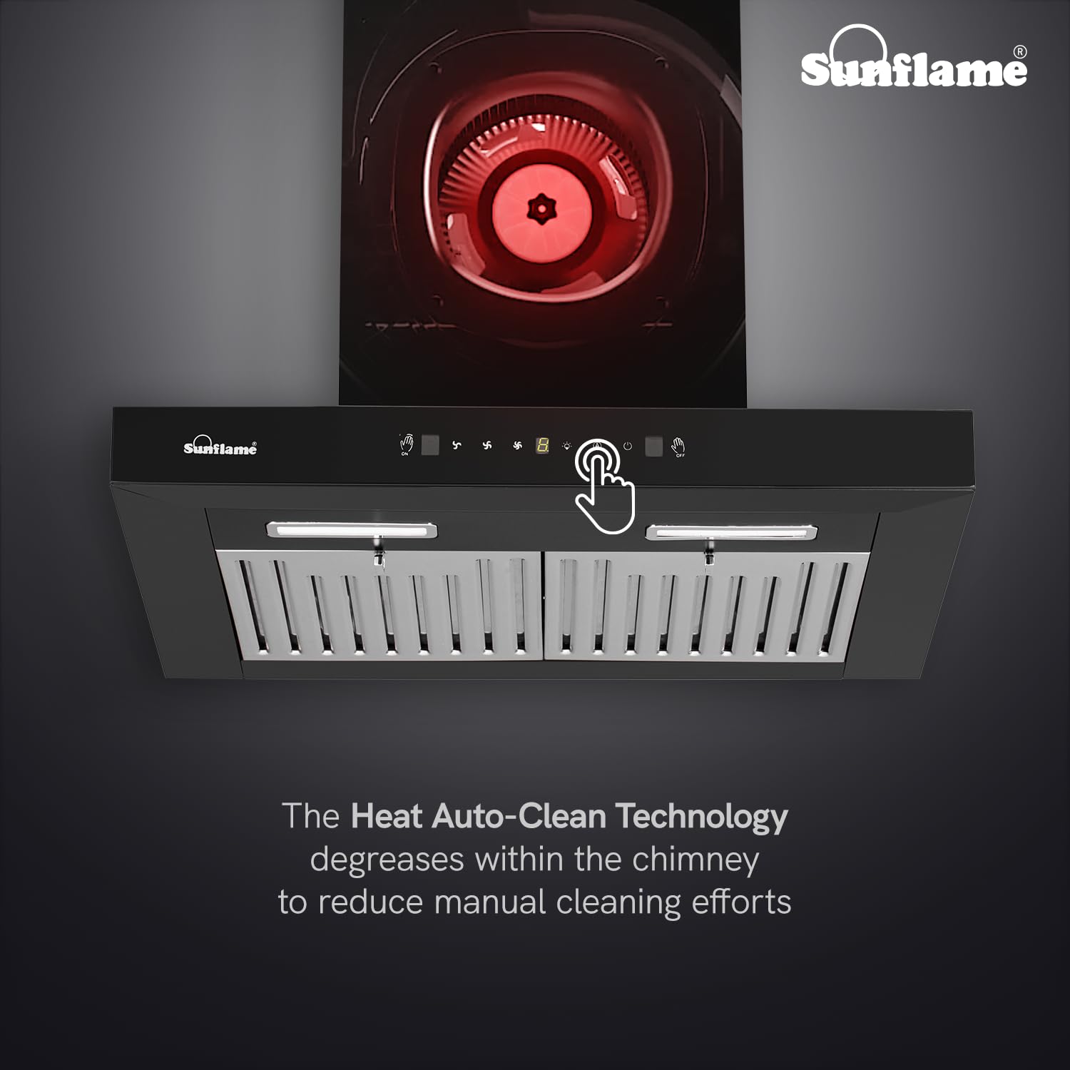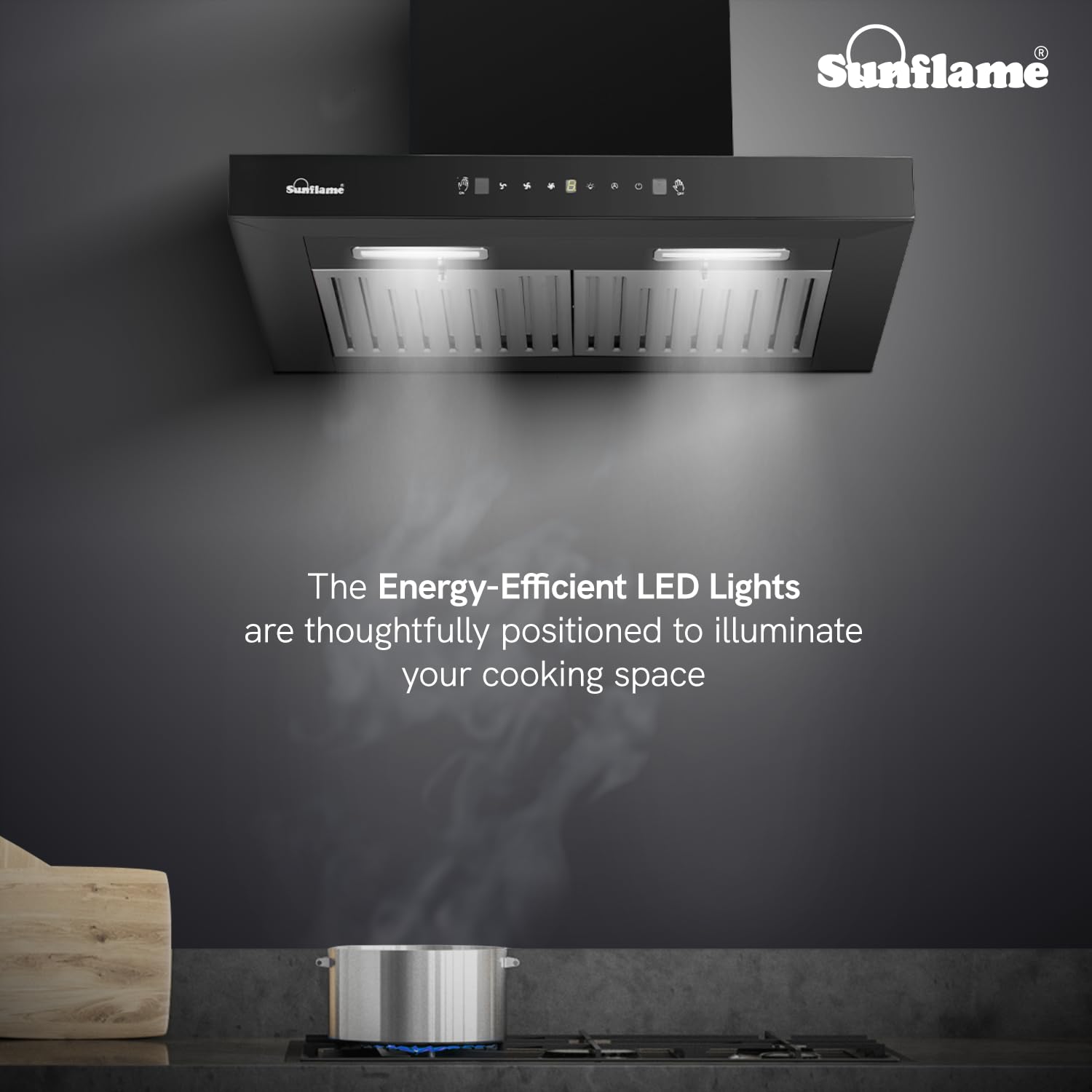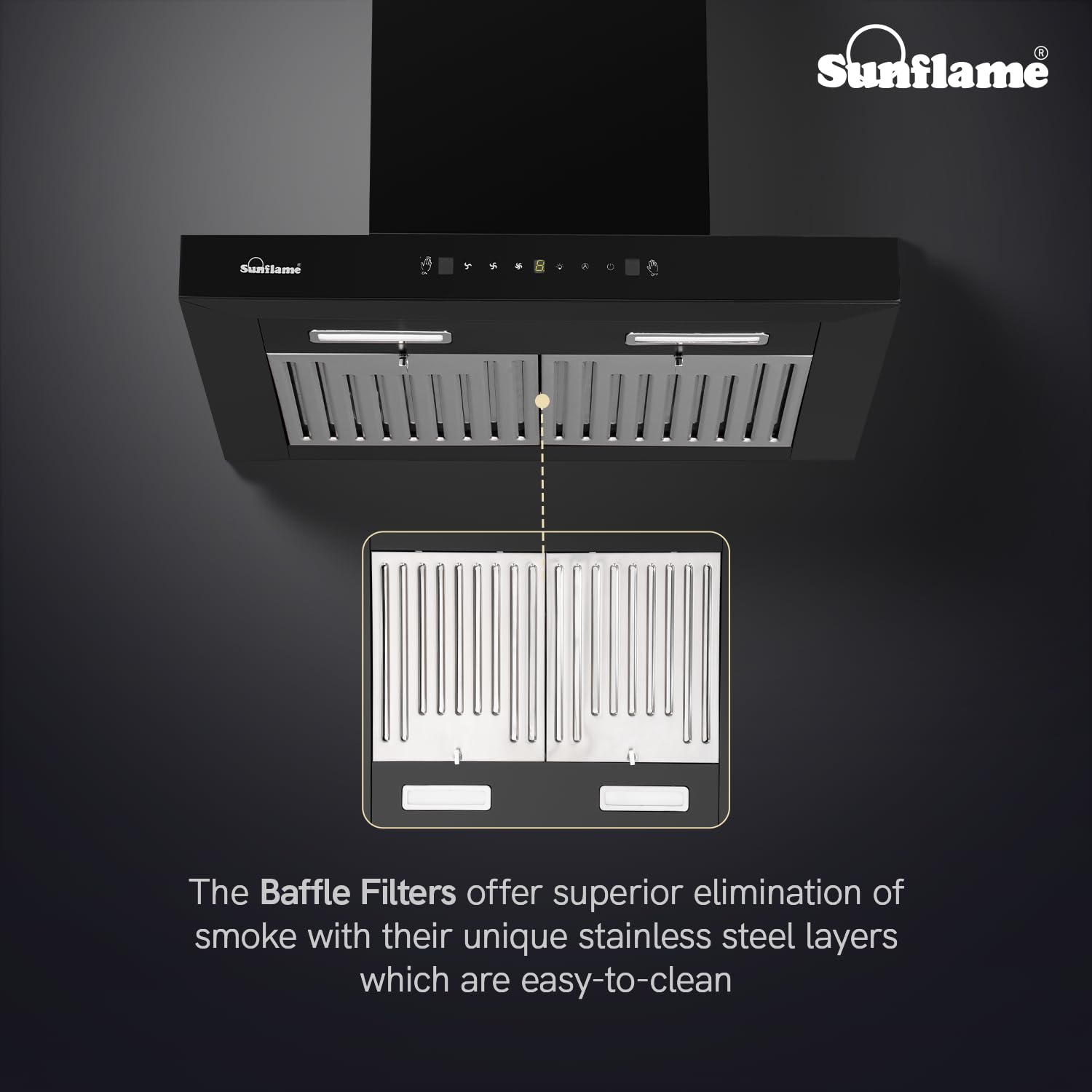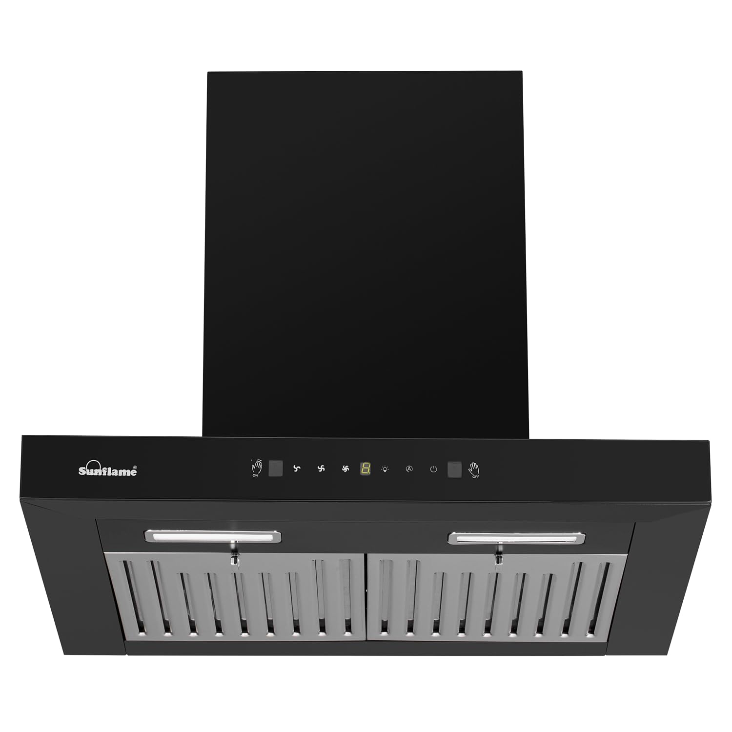 The Sunflame Lancer Chimney for Kitchen is a compact, 60cm-wide kitchen chimney that takes up minimal space while enhancing your kitchen’s interiors. It features a powerful motor with a high suction capacity of 1250 m³/h, making it the ideal chimney for kitchen use. Equipped with highly efficient stainless steel baffle filters, this chimney effectively traps smoke and airborne particles, ensuring a pleasant and smoke-free cooking environment. The smart touch heat auto-clean technology further adds to your convenience by melting away oil and grease deposits within the chimney, eliminating the need for frequent manual cleaning. Additionally, the chimney comes with a large-capacity, easily removable oil cup, reducing maintenance efforts and enhancing its longevity. Its 3-speed exhaust setting is designed to cater to various cooking needs, efficiently handling different levels of smoke and odor intensity, and keeping your kitchen hygienic and smoke-free regardless of the dish you’re preparing. The durable, heat-resistant body of this kitchen chimney boasts a sleek matte black finish, adding elegance to your kitchen interiors. Its wide coverage enhances its efficiency for maximum suction. The Sunflame Lancer chimney also features advanced gesture control technology, energy-efficient high-lumen LED lights, and a user-friendly touch panel for added convenience. With 1-year product coverage and a 5-year motor warranty, this chimney ensures peace of mind and reliable service. The PAN-India service network, multiple direct service centers, and dedicated customer care support make the Sunflame Lancer Chimney a dependable and durable addition to any kitchen.