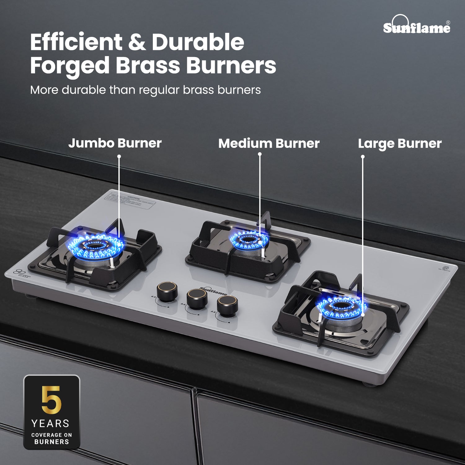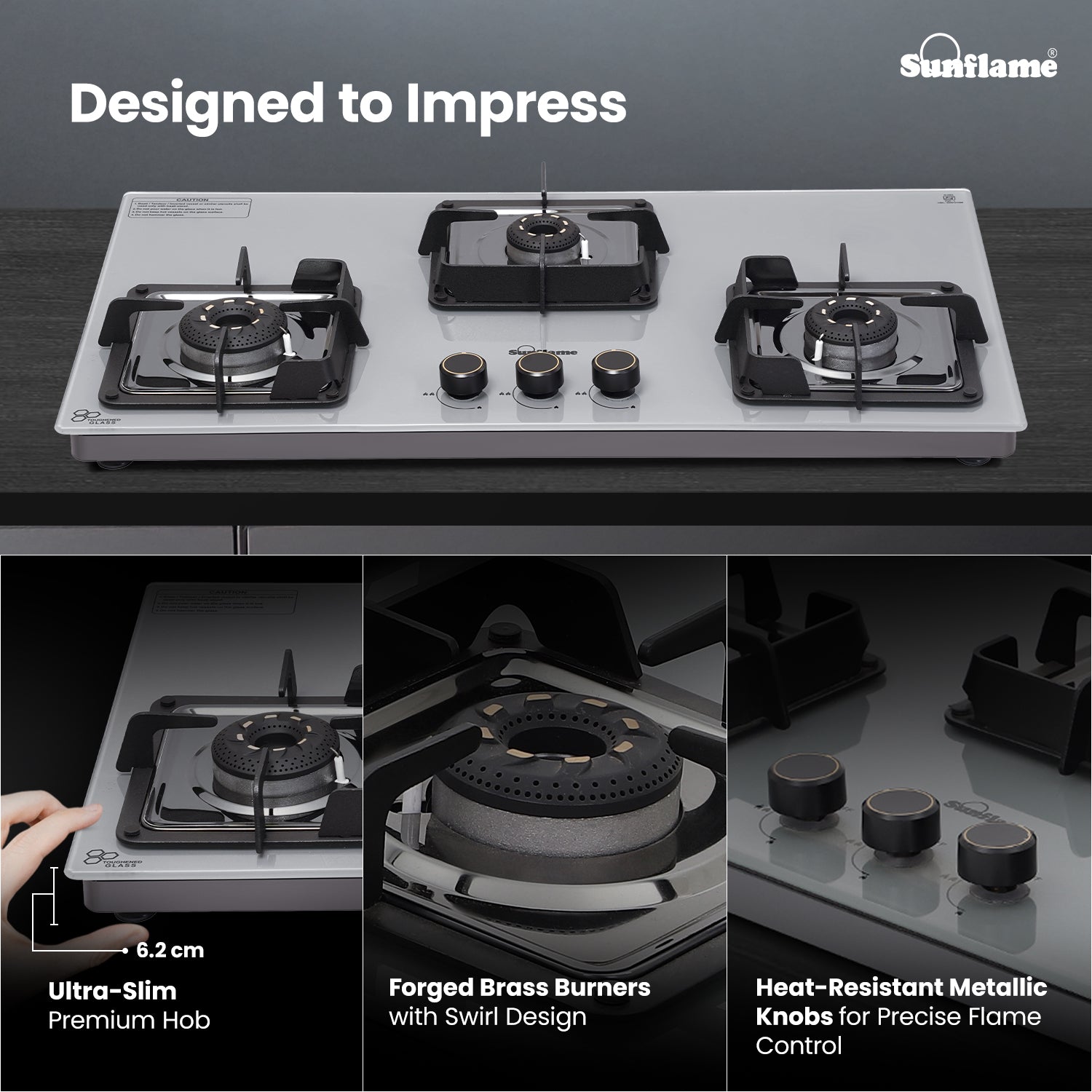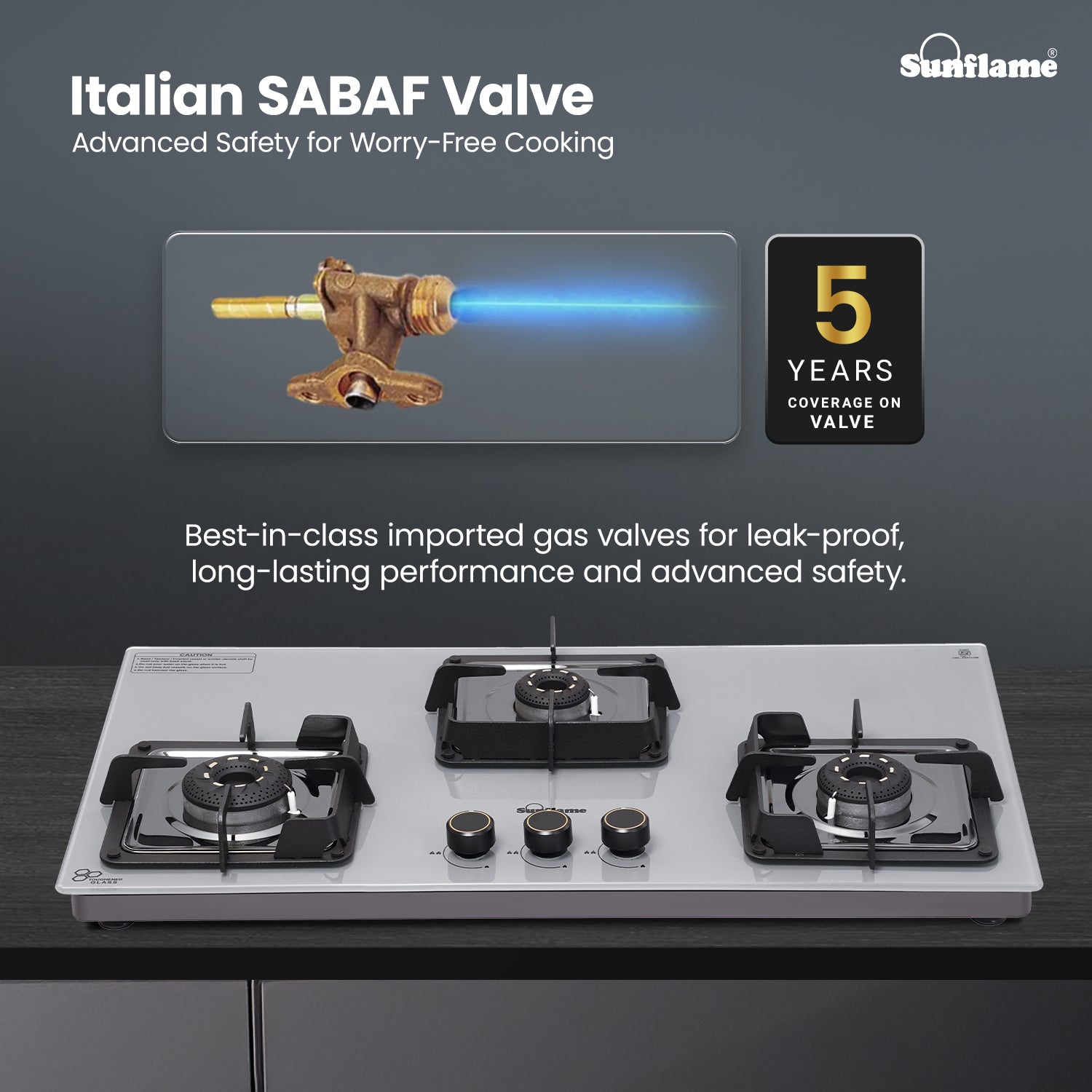 The Sunflame 3 Burner ultra-slim countertop hob combines style, efficiency, and safety for a seamless cooking experience. Featuring Italian SABAF gas valves, it provides advanced leak-proof safety and long-lasting performance. Equipped with high-efficiency blue flame forged brass burners, this hob top is sure to provide faster and efficient cooking performance for high-flame Indian cooking. The stylish swirl design of the burners adds a premium aesthetic look to the hob. Sturdy pan supports provide stability for heavy Indian cookware, and these pan supports come with flame guard to keep the knobs cool and shield the flame from wind. The hob features a durable 8 mm thick tempered glass top for a sleek, modern look. The 1.5 V battery-operated auto-ignition enables quick burner ignition, while ergonomic, heat-resistant metallic knobs provide precise flame control. The hob also features removable dual gloss black drip trays for easy cleaning, and the 360-degree LPG inlet nozzle offers flexible connection to the LPG hose pipe. Backed by 5 years of coverage on the glass top, burners, valves, and 2 years on the product, and 5 years of doorstep service, Sunflame offers complete peace of mind. With PAN India presence across 240+ service centers, Sunflame ensures reliable performance and dependable after-sales support.