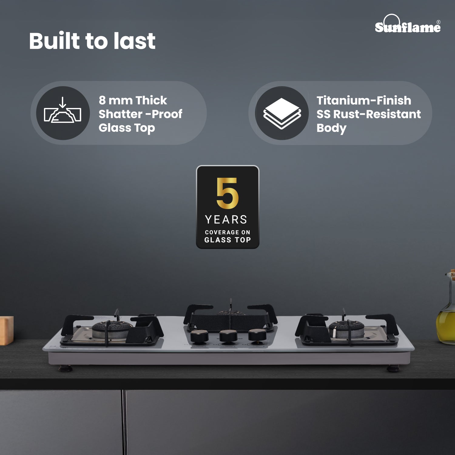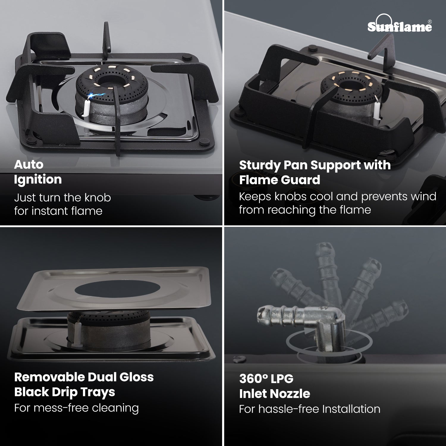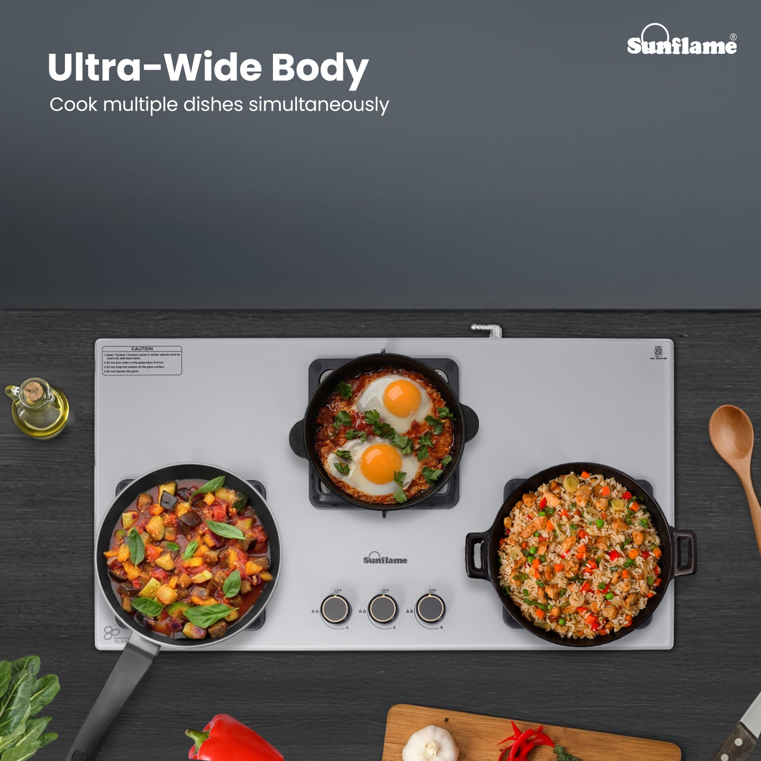 The Sunflame 3 Burner ultra-slim countertop hob combines style, efficiency, and safety for a seamless cooking experience. Featuring Italian SABAF gas valves, it provides advanced leak-proof safety and long-lasting performance. Equipped with high-efficiency blue flame forged brass burners, this hob top is sure to provide faster and efficient cooking performance for high-flame Indian cooking. The stylish swirl design of the burners adds a premium aesthetic look to the hob. Sturdy pan supports provide stability for heavy Indian cookware, and these pan supports come with flame guard to keep the knobs cool and shield the flame from wind. The hob features a durable 8 mm thick tempered glass top for a sleek, modern look. The 1.5 V battery-operated auto-ignition enables quick burner ignition, while ergonomic, heat-resistant metallic knobs provide precise flame control. The hob also features removable dual gloss black drip trays for easy cleaning, and the 360-degree LPG inlet nozzle offers flexible connection to the LPG hose pipe. Backed by 5 years of coverage on the glass top, burners, valves, and 2 years on the product, and 5 years of doorstep service, Sunflame offers complete peace of mind. With PAN India presence across 240+ service centers, Sunflame ensures reliable performance and dependable after-sales support.