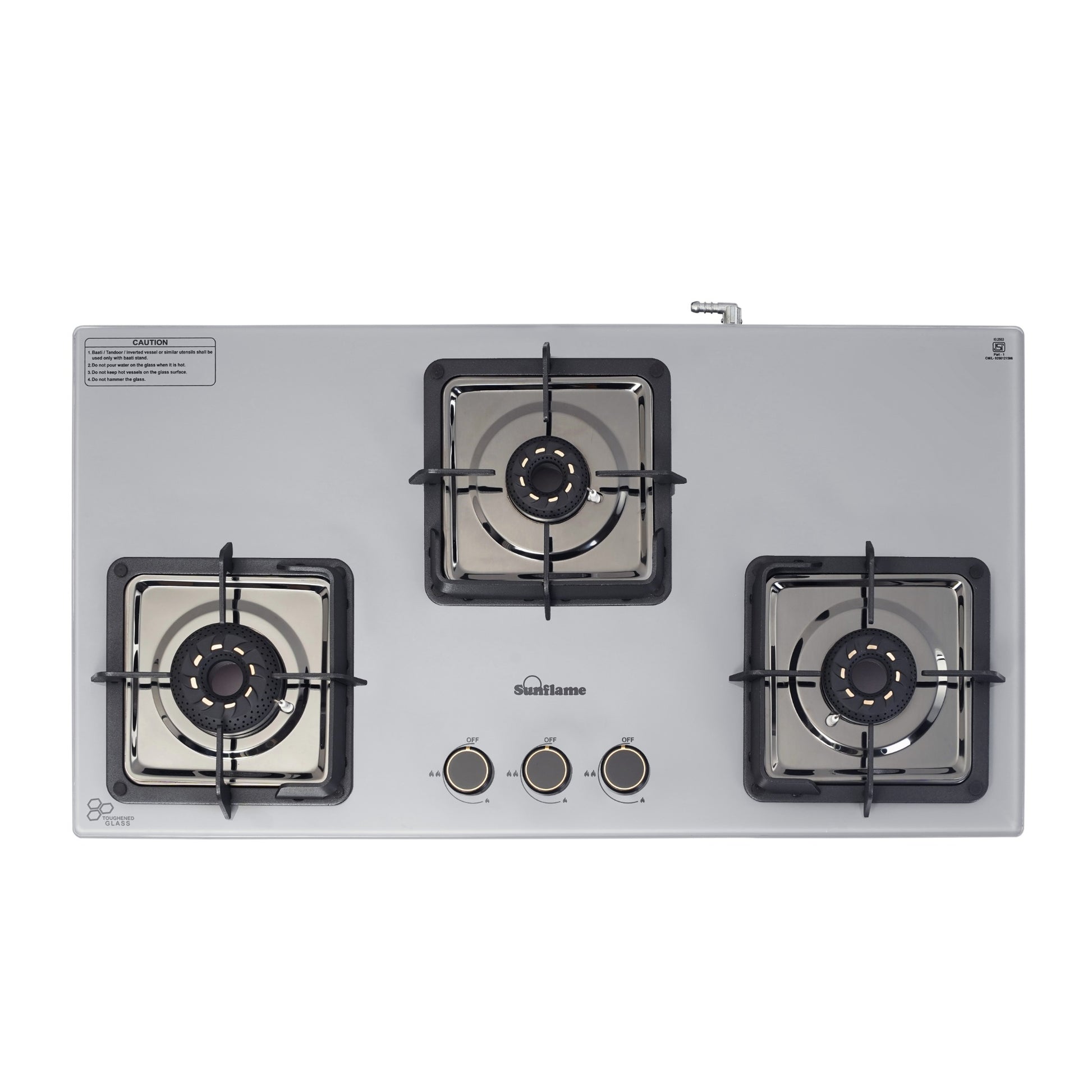The Sunflame 3 Burner ultra-slim countertop hob combines style, efficiency, and safety for a seamless cooking experience. Featuring Italian SABAF gas valves, it provides advanced leak-proof safety and long-lasting performance. Equipped with high-efficiency blue flame forged brass burners, this hob top is sure to provide faster and efficient cooking performance for high-flame Indian cooking. The stylish swirl design of the burners adds a premium aesthetic look to the hob. Sturdy pan supports provide stability for heavy Indian cookware, and these pan supports come with flame guard to keep the knobs cool and shield the flame from wind. The hob features a durable 8 mm thick tempered glass top for a sleek, modern look. The 1.5 V battery-operated auto-ignition enables quick burner ignition, while ergonomic, heat-resistant metallic knobs provide precise flame control. The hob also features removable dual gloss black drip trays for easy cleaning, and the 360-degree LPG inlet nozzle offers flexible connection to the LPG hose pipe. Backed by 5 years of coverage on the glass top, burners, valves, and 2 years on the product, and 5 years of doorstep service, Sunflame offers complete peace of mind. With PAN India presence across 240+ service centers, Sunflame ensures reliable performance and dependable after-sales support.