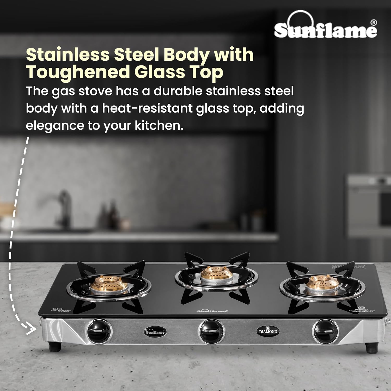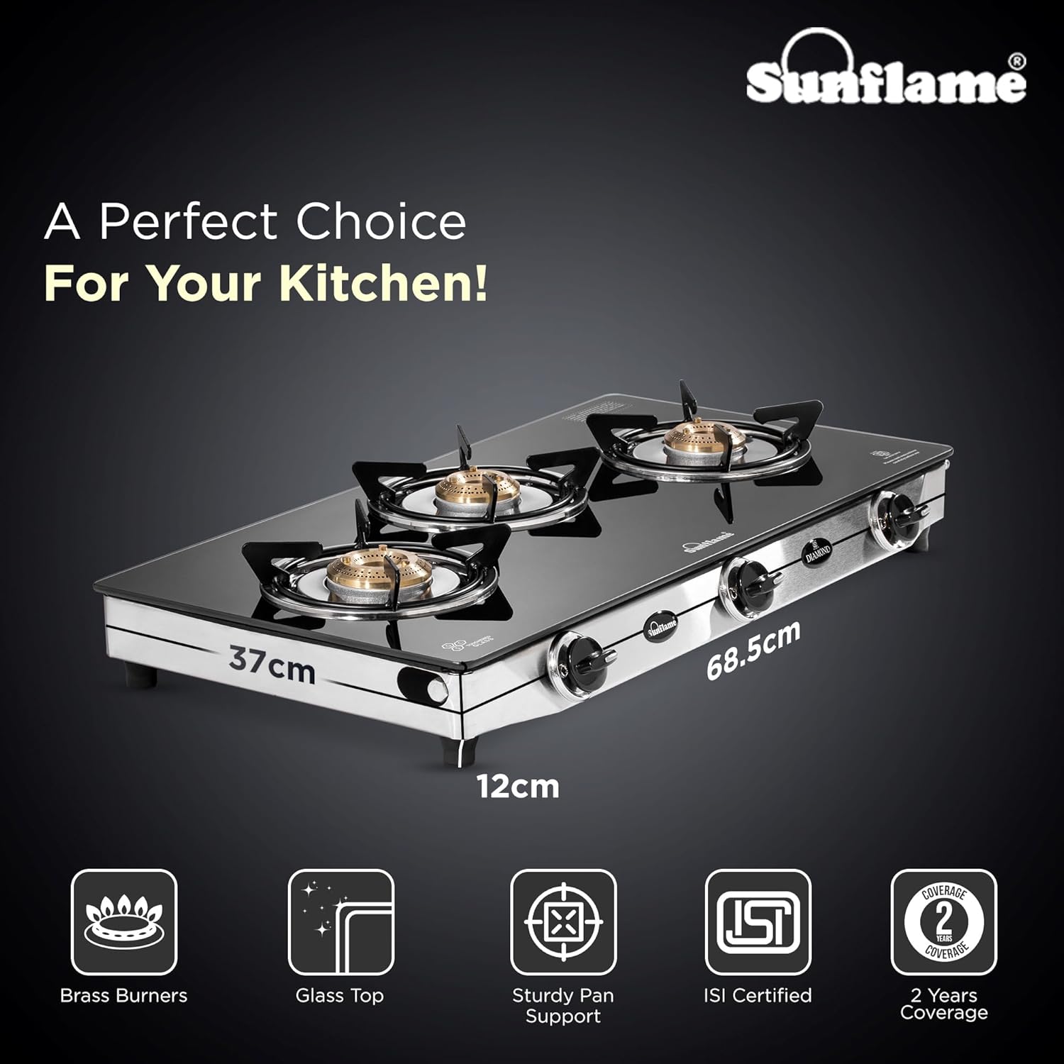 Diamond 3 Burner Gas Stove | 1 Medium and 2 Small Brass Burners |Toughened Glass Top |Steel