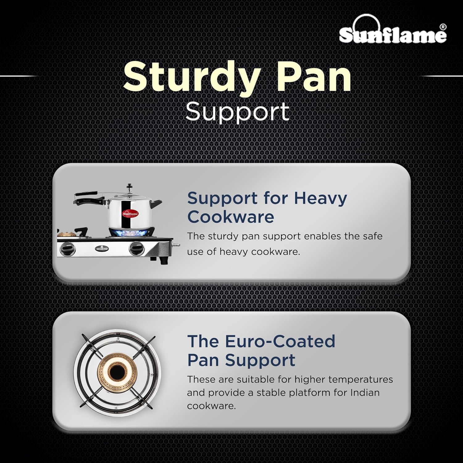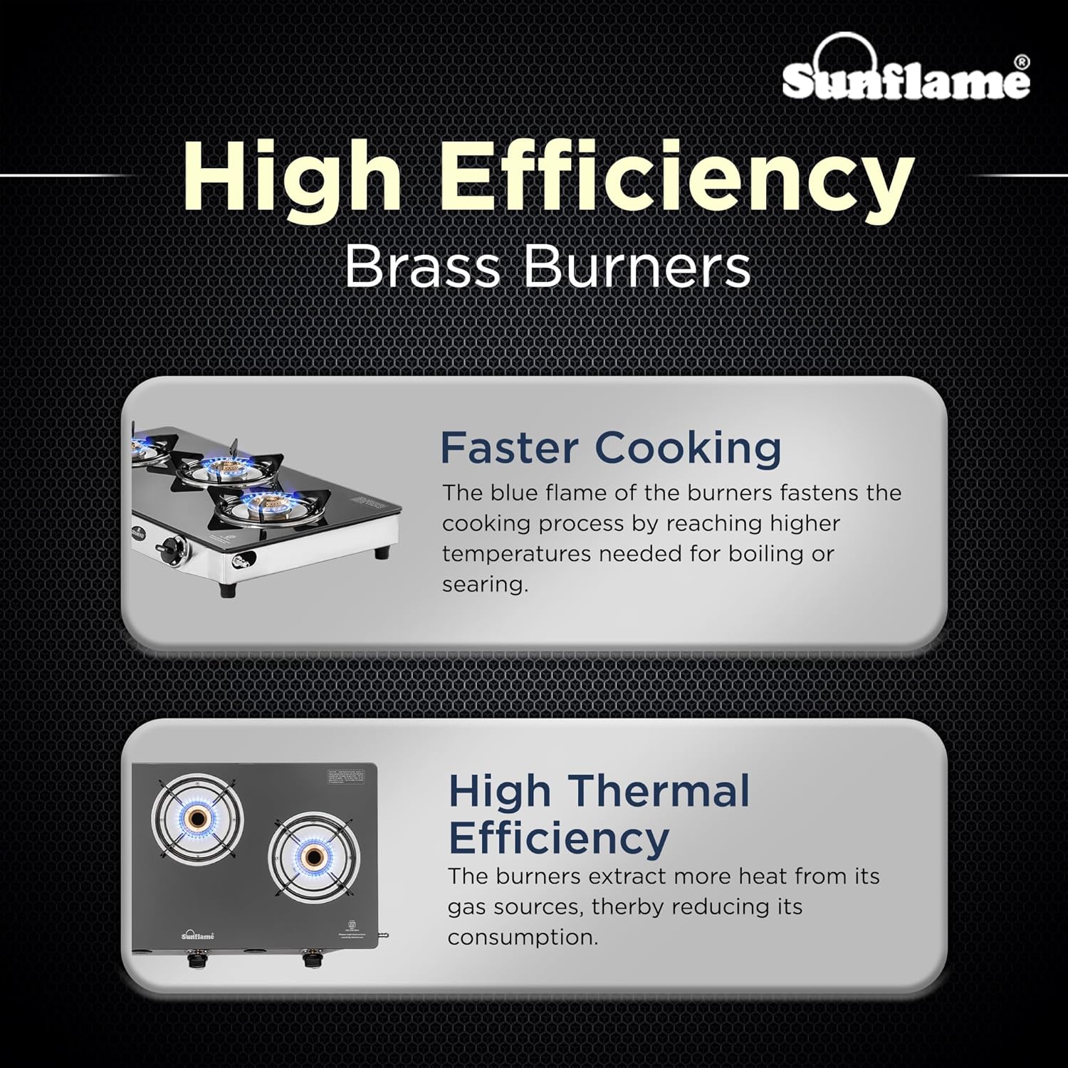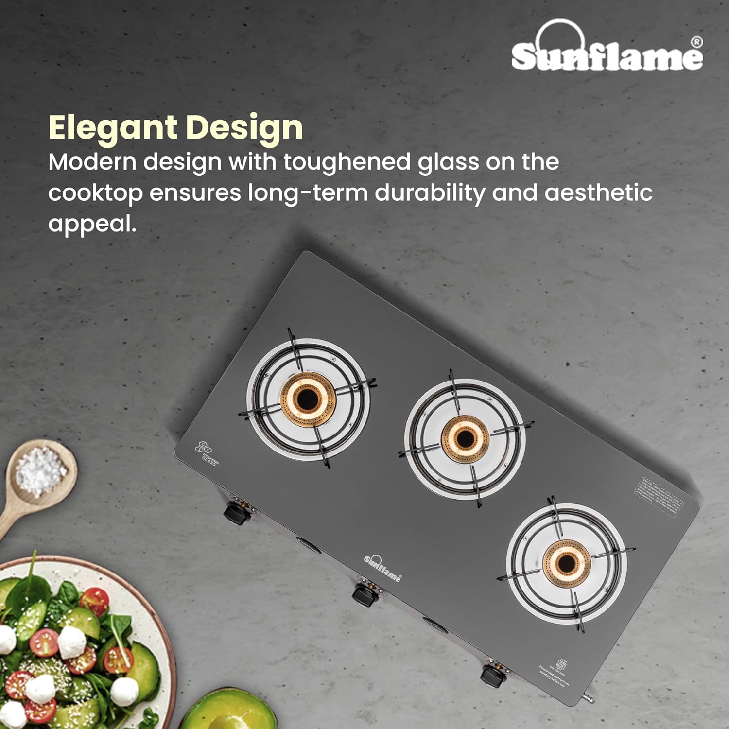 The Sunflame 3 burner gas stove features an elegant design with a high-quality glass top, heat-resistant nylon knobs, and ISI certified safety features. It is ready for use with LPG and comes with a 2-year product warranty, including home services. The stove features sturdy anti-skid legs for secure cooking, preventing accidental slips and slides. It operates manually and requires a lighter or matchstick for ignition. The stove is environmentally friendly, emitting low CO2 and improving indoor air quality. It also emits low CO2, promoting sustainability.