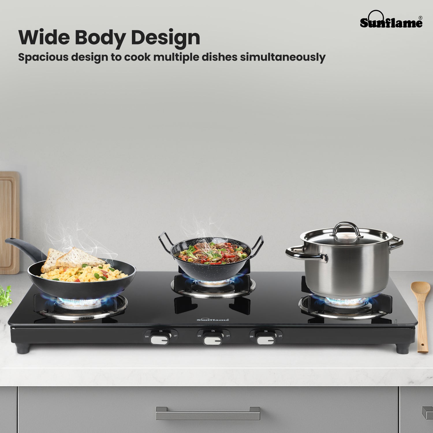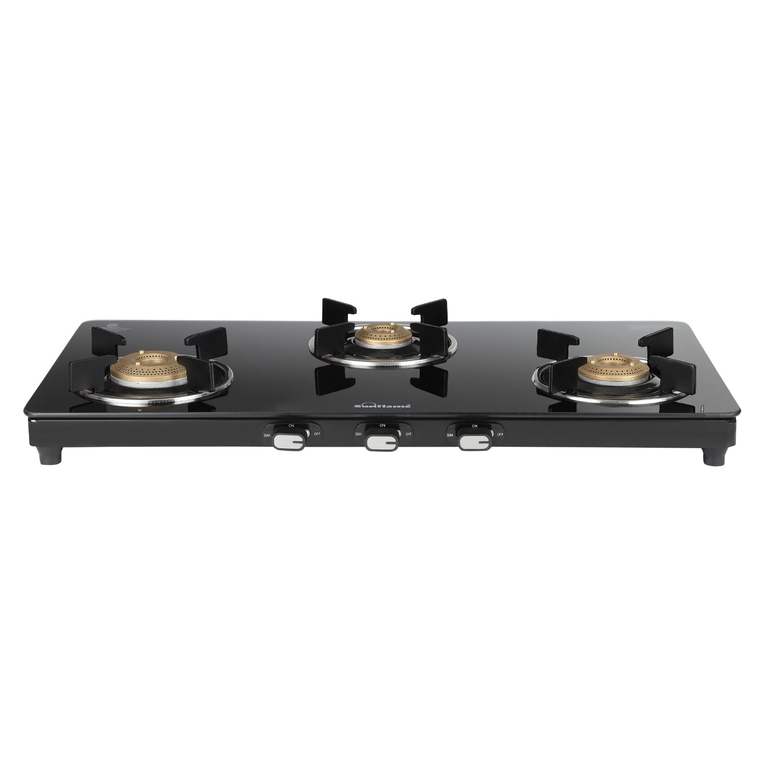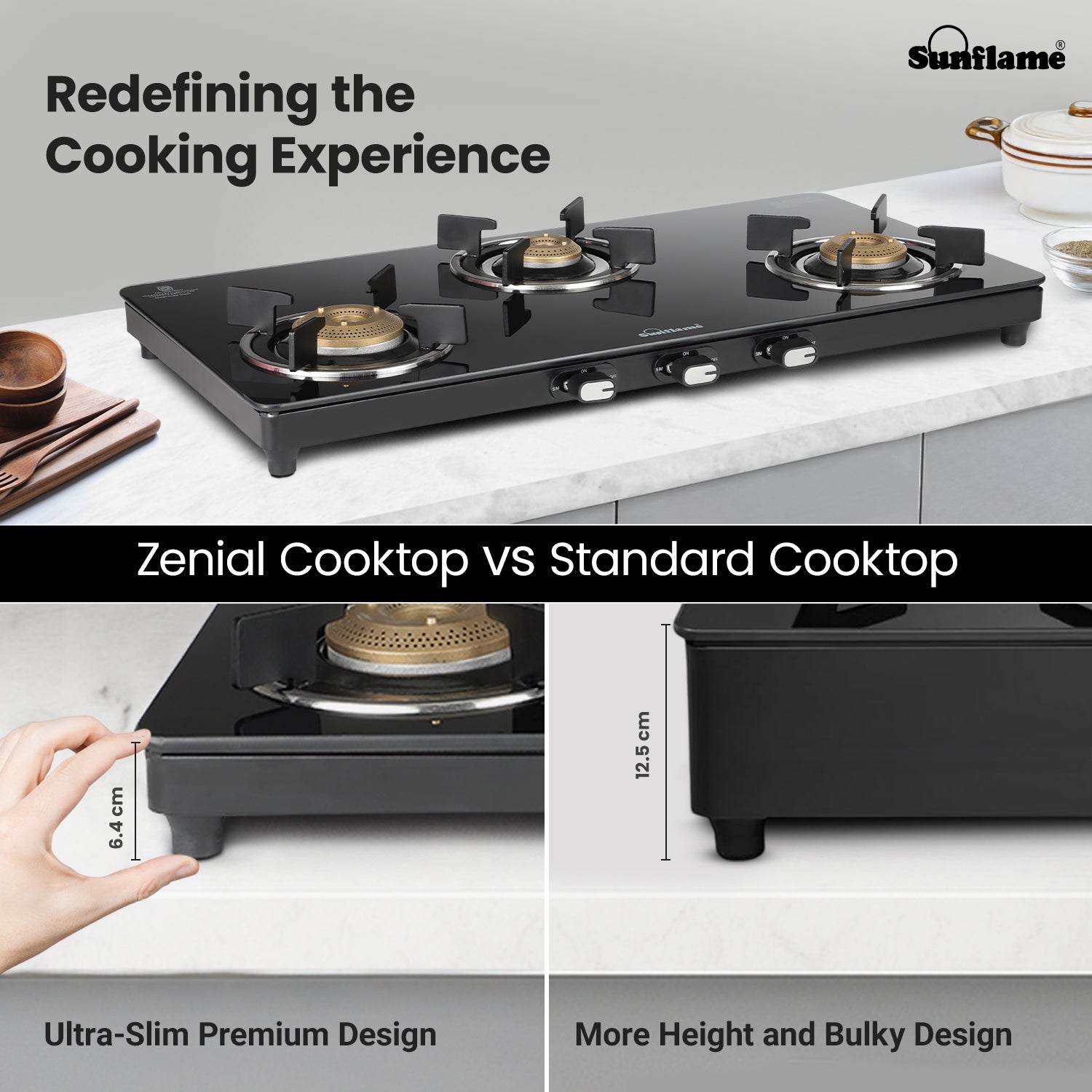 Zenial 3 Burner Slim Glass Top Gas Stove | 75 cm Wide | Toughened Glass Top