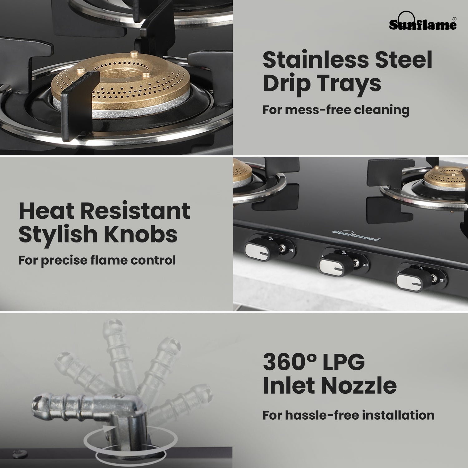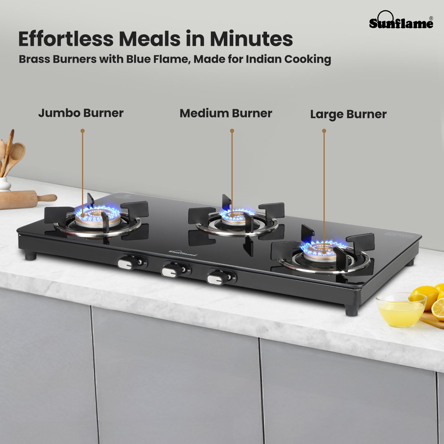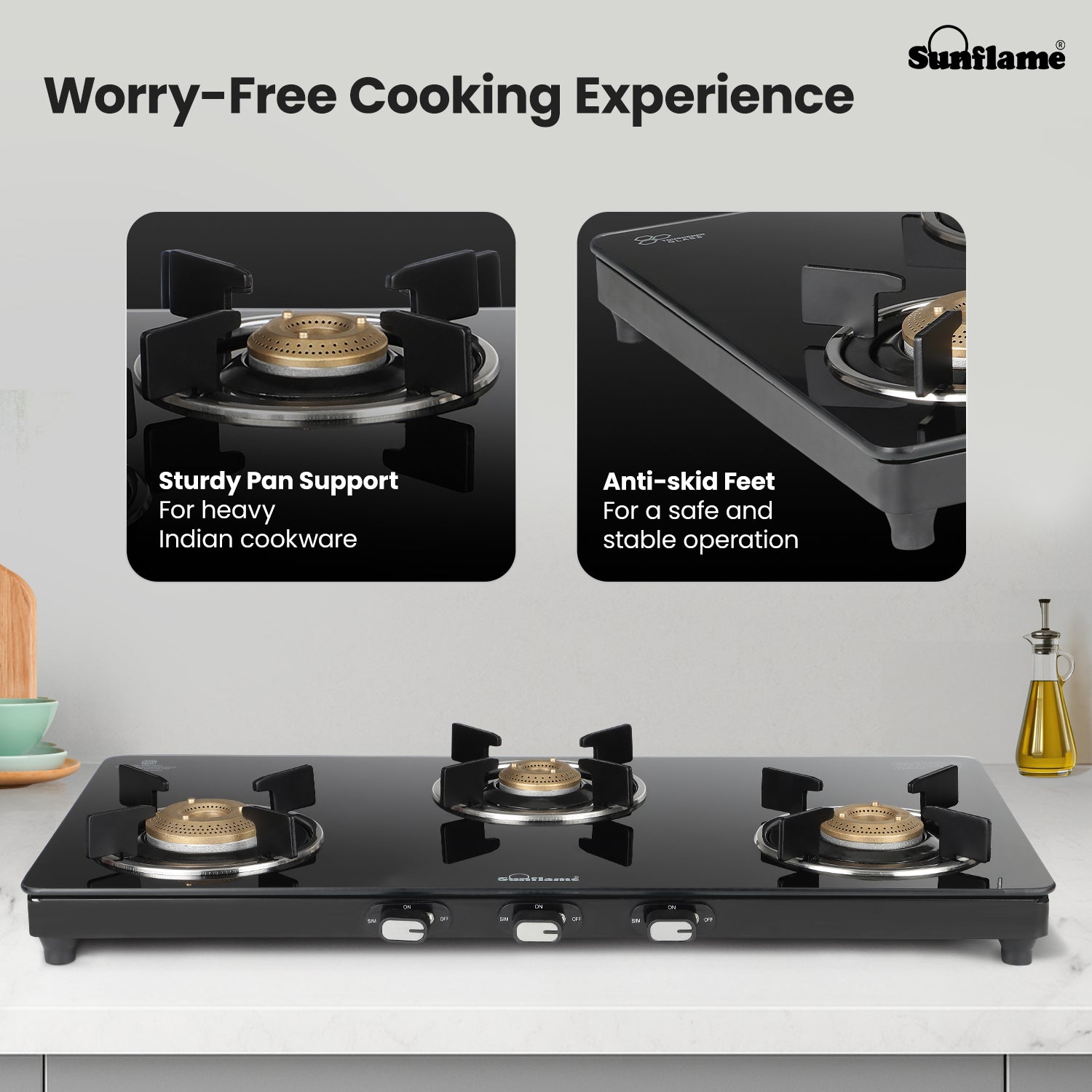 The Sunflame Zenial 3-burner slim glass top gas stove combines style, efficiency, and durability for a premium cooking experience. Its sleek, slim body elevates your kitchen's modern look—offering a premium upgrade over conventional bulky gas stoves. Equipped with high-efficiency brass burners, this 3 burner gas stove ensures faster and more efficient cooking performance, ideal for high-flame Indian cooking. The shatter-proof toughened glass top and the scratch- and corrosion-resistant GP sheet body ensure durability for years to come. The ergonomic, heat-resistant knobs provide precise flame control, while the sturdy pan supports offer stability for heavy Indian cookware. Its wide body design supports multitasking with ease, enabling the simultaneous use of multiple cookware items. Featuring a 360° rotating LPG inlet nozzle, it enables flexible connection to the LPG hose pipe. Backed by 5 years of warranty on the glass top and valves, 2 years on the burners and overall product, Sunflame offers complete peace of mind. With a PAN India presence across 240+ service centres and 5 years of doorstep service, Sunflame ensures reliable performance and dependable after-sales support.