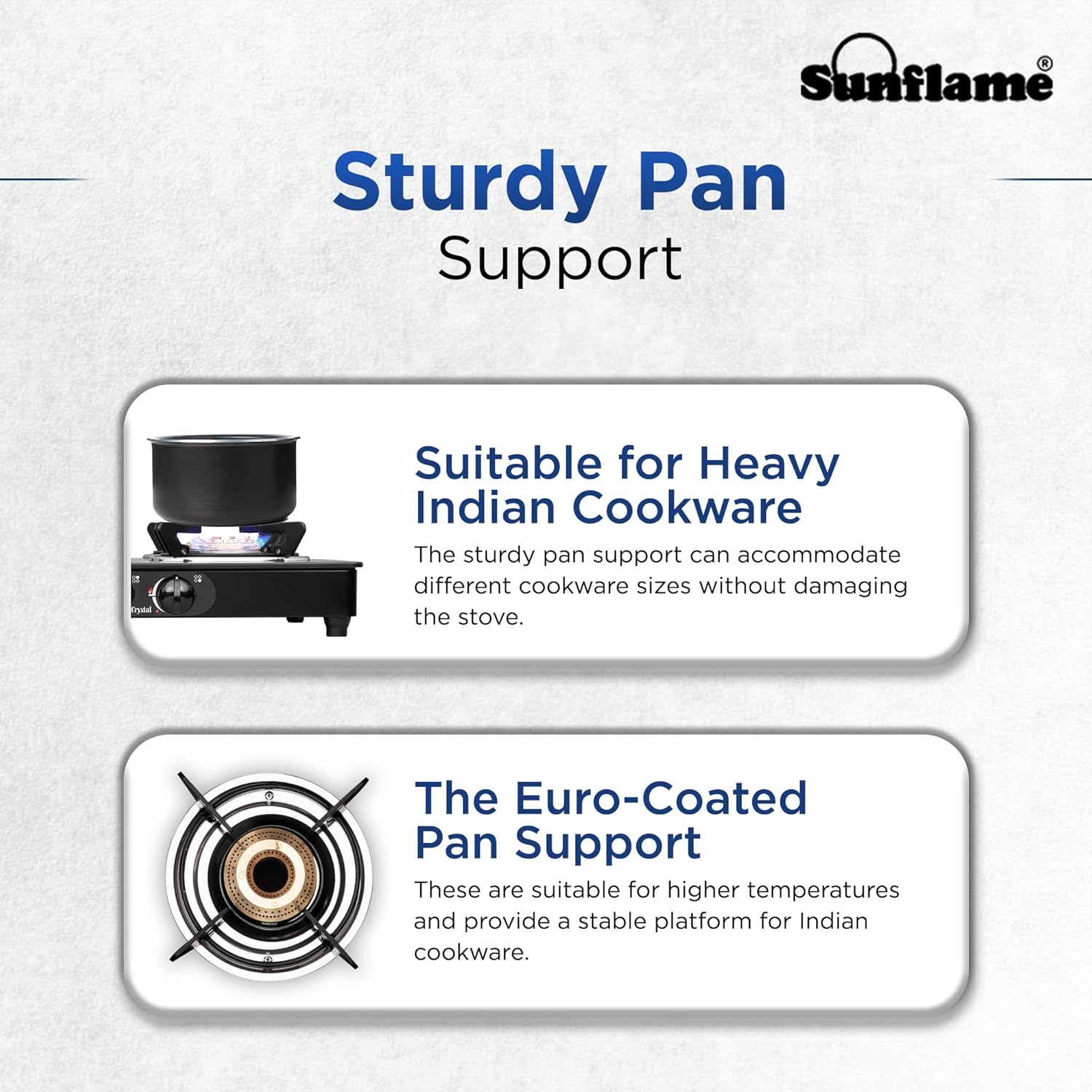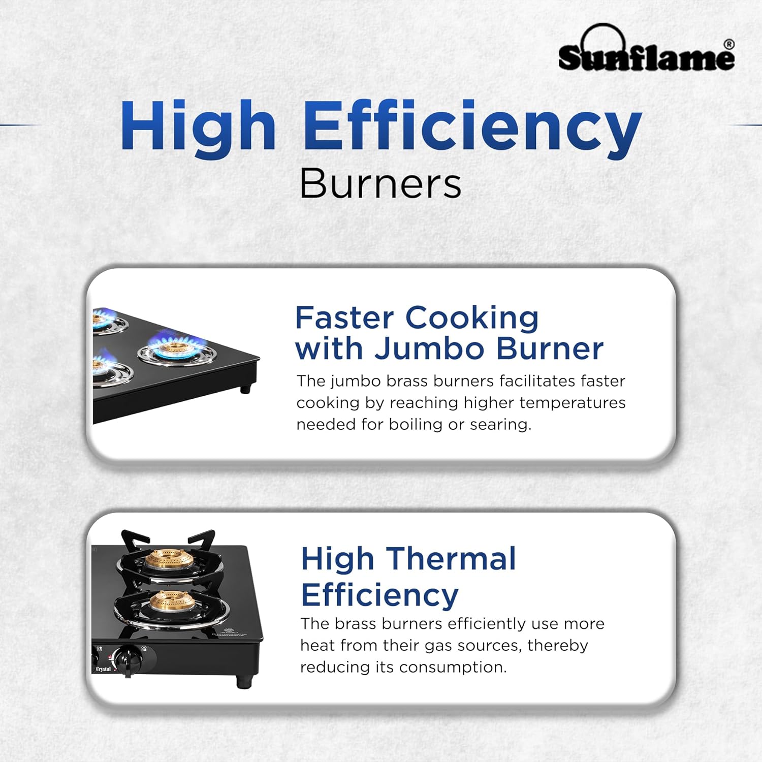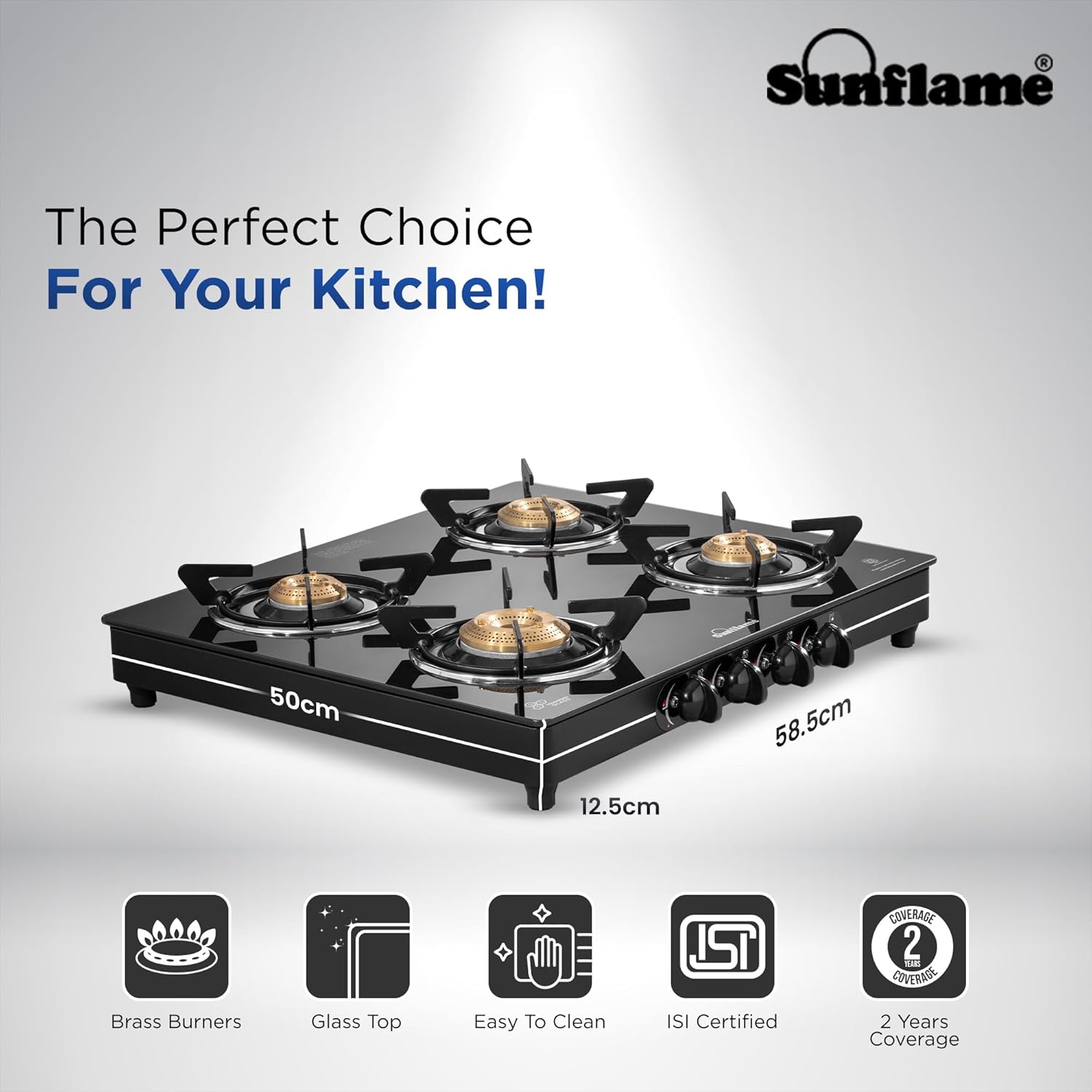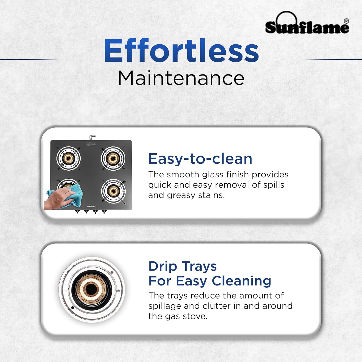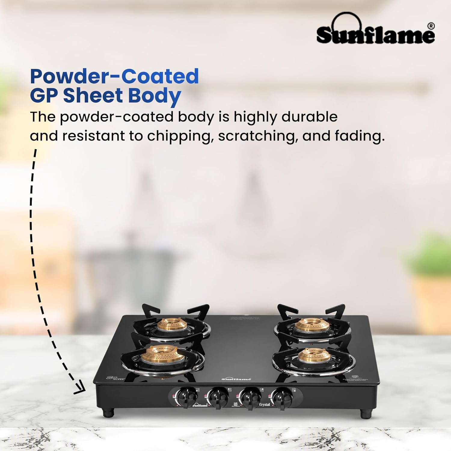 The Sunflame Crystal 4 Burner Gas Stove is a stylish, wide-body stove with a jumbo brass burner for optimal fuel utilization and quick cooking. It operates manually and requires a lighter or matchstick to ignite. The stove is ISO certified, meeting BIS standards for safety and quality. It features anti-skid legs for secure cooking, preventing accidental slips and slides. The stove also emits low CO2 and promotes environmental sustainability by reducing carbon footprint and ensuring healthier indoor air quality. It operates manually and comes with a 2-year manufacturer warranty.
